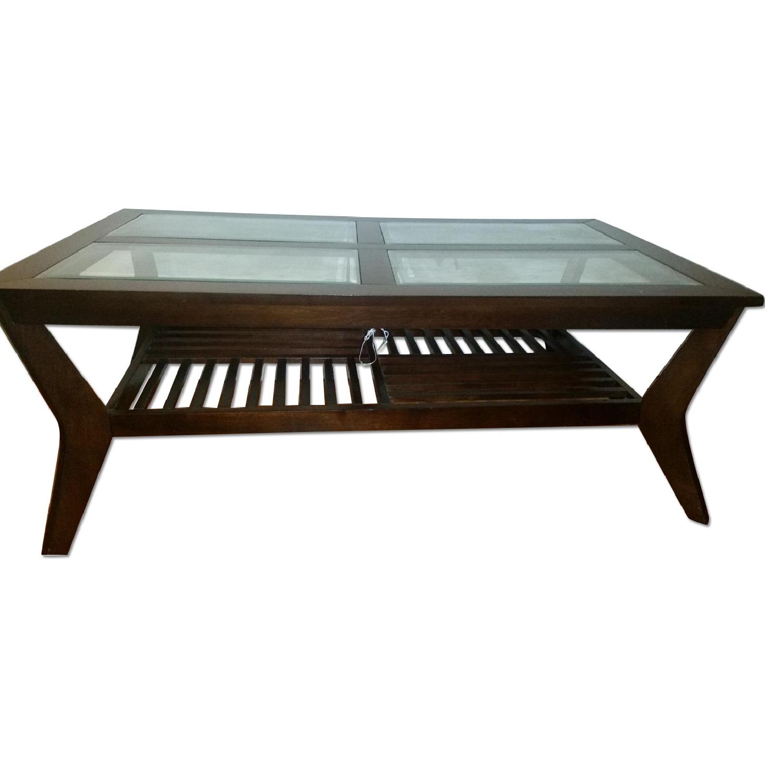 Seller's Notes:Beautiful mixed material coffee table , needs a new home to make room for a new baby. Glass like new, wood has minor scratches, slight shift between legs, but fully in tack.