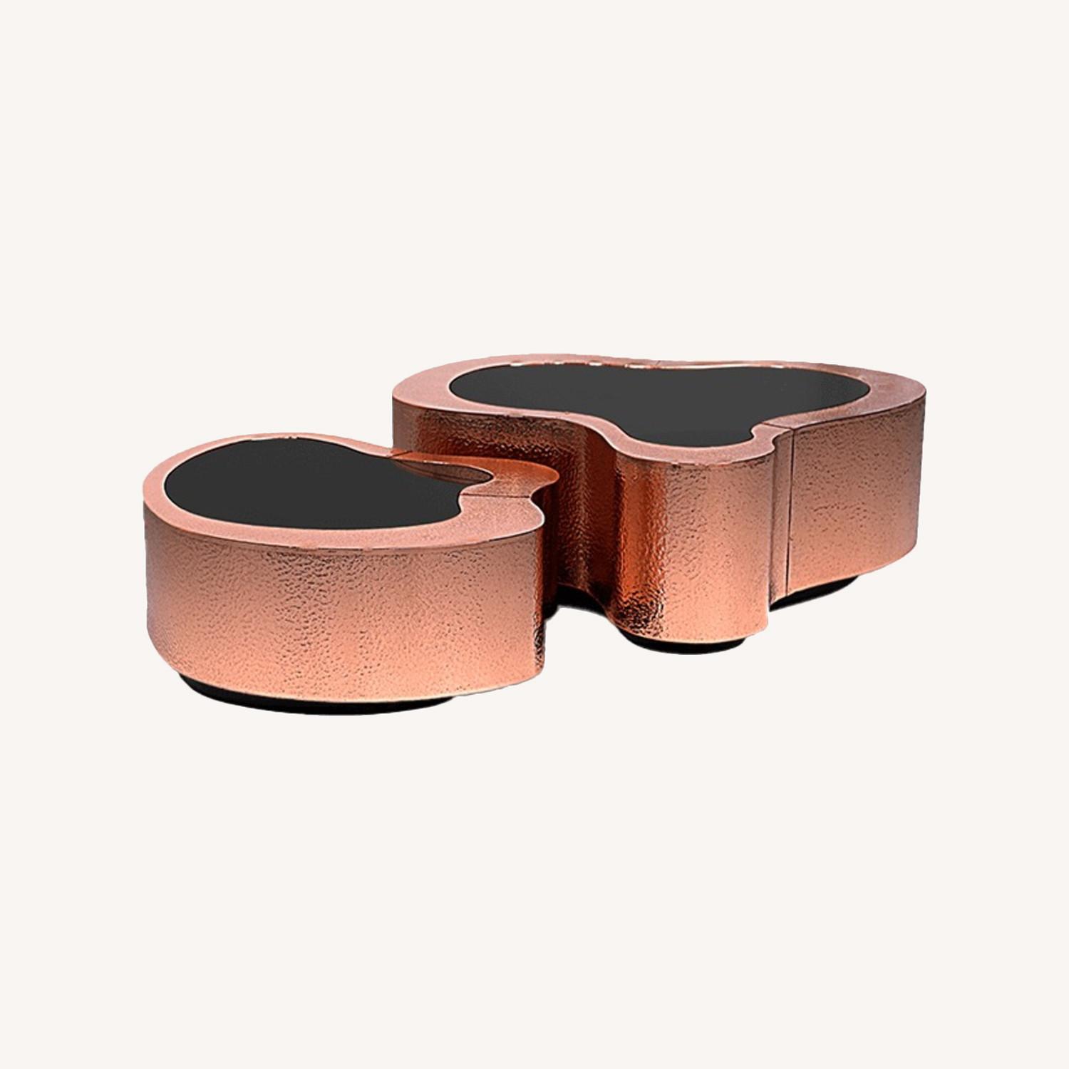 Seller's Notes:The Wave Center Table is a statement piece that draws inspiration from coastal rock formations the waves have sculpted, curving their rough shapes through thousands of years of a timed collision. Made in wood and coated in either manually hammered copper with the top joins a black mirror shell that emulates the accumulation of water. The black lacquered base is finished with a high gloss varnish. . Wave is available as a set of two tables with different shapes that suit modern sitting and living rooms alike. PRODUCT FEATURES Table made in wood finished with manually hammered copper, with a curvilinear top made from black mirror. The base is lacquered in black finished with a high gloss varnish. Selling as a set, Good condition minor scratched that blend in with hammered weathered look. Large- W 37.8 IN | D 39.0 IN | H 14.6 IN (Retailing for $7,250) Small-W 34.6 IN | D 28.7 IN | H 12.2 IN (Retailing for $6.370)