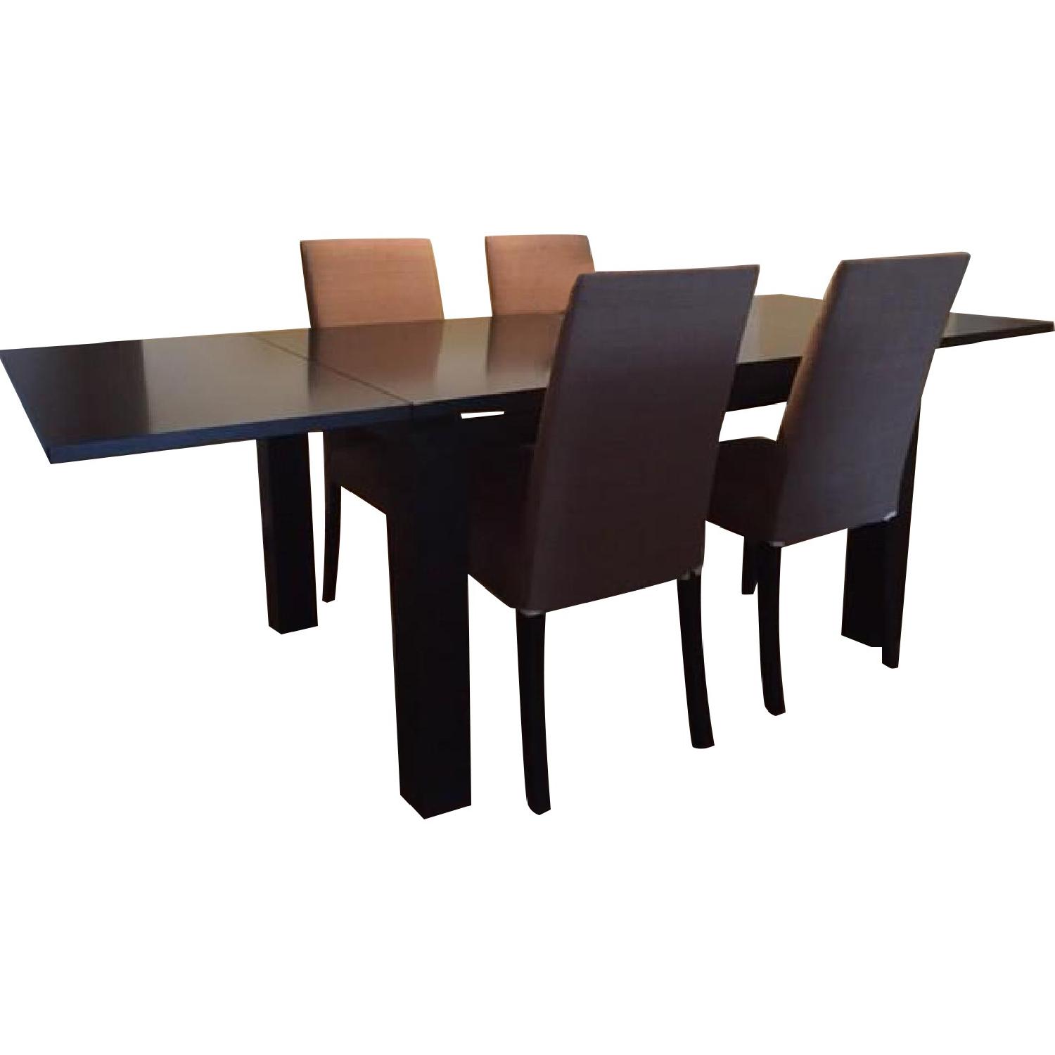 Seller's Notes:Bo Concept dining table and 4 chairs. The table has two built in leaves. Opens to 71" with one leaf open and 90-1/2 with both leaves open.The chairs have (2) sets of interchangeable covers.