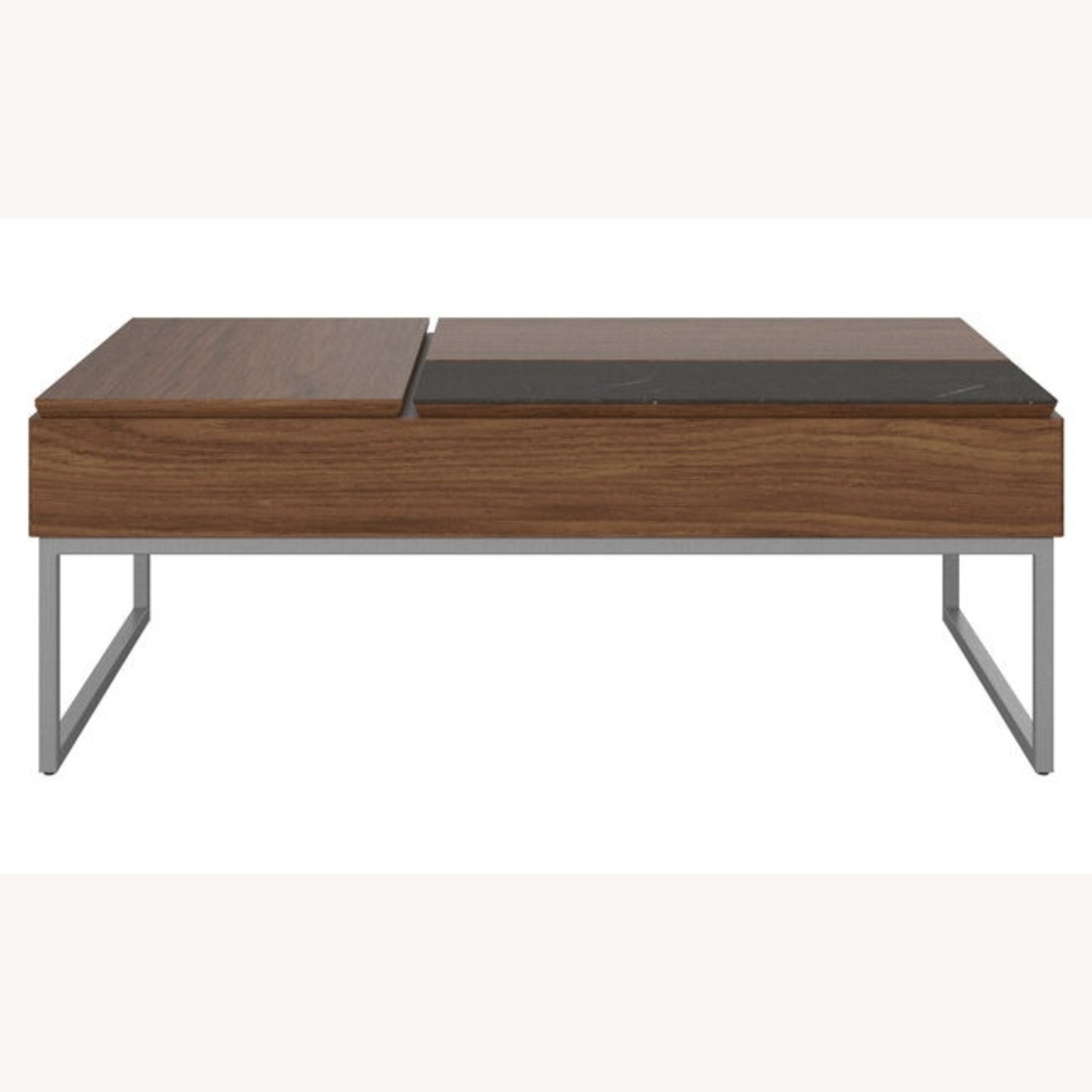 Functionality meets great design and style in this coffee table. Hide your magazines, remotes and cables in the clever integrated storage compartments. Alternatively raise the slim table top for your laptop, book or afternoon snack.