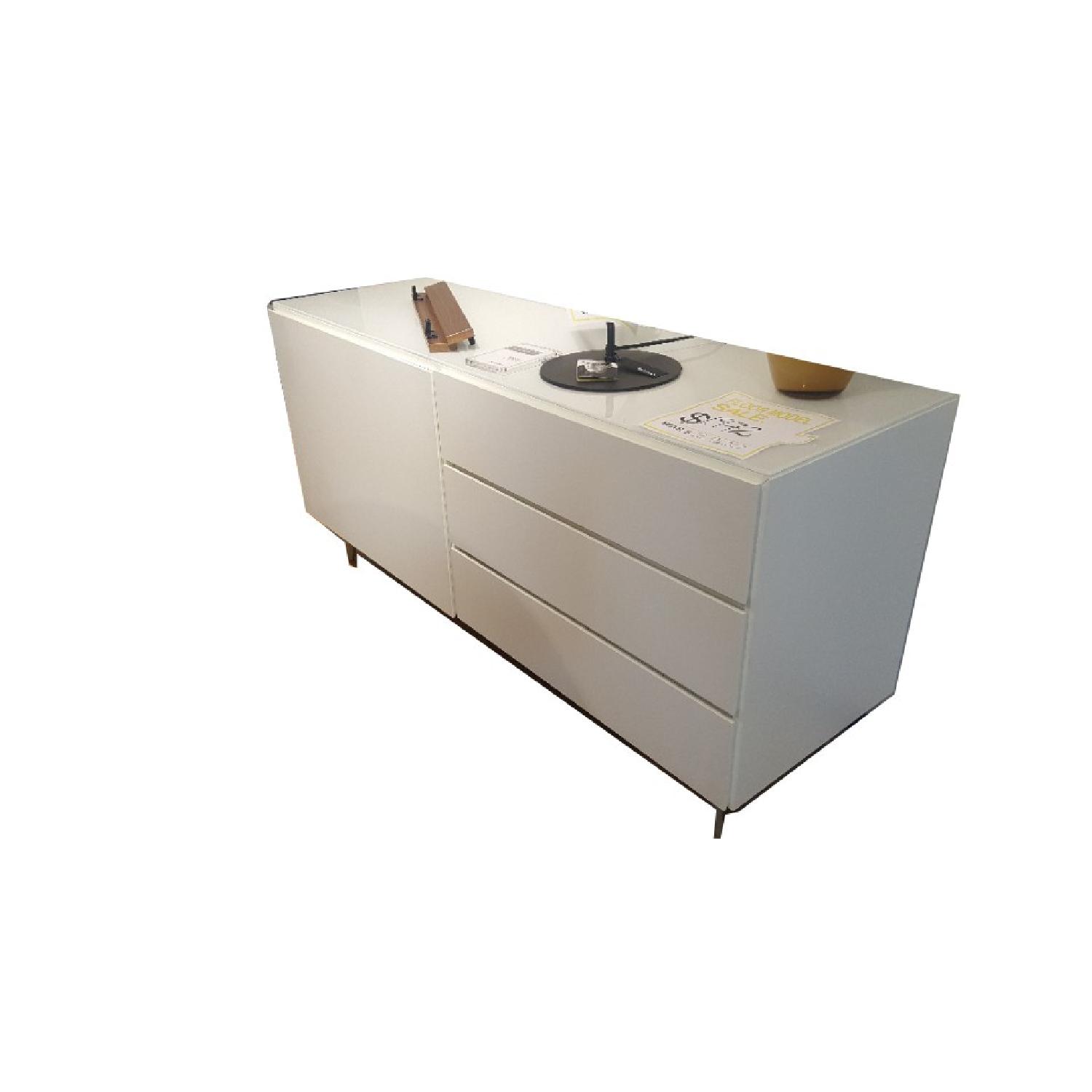 Seller's Notes:Lugano sideboard, Matte white lacquered/white glass, H29¼xW60¾xD19"