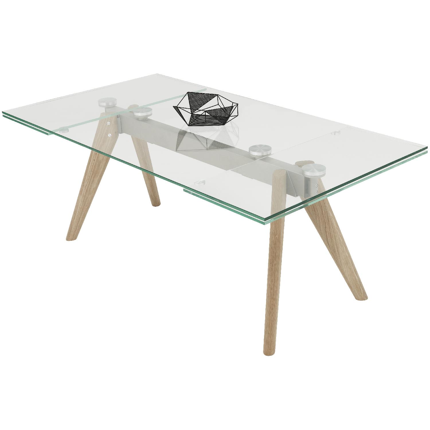 Seller's Notes:Monza table with supplementary tabletops, available in different colors. As shown, clear glass/titanium gray burnished steel/oak,H29½xW75/110¼xD39½"