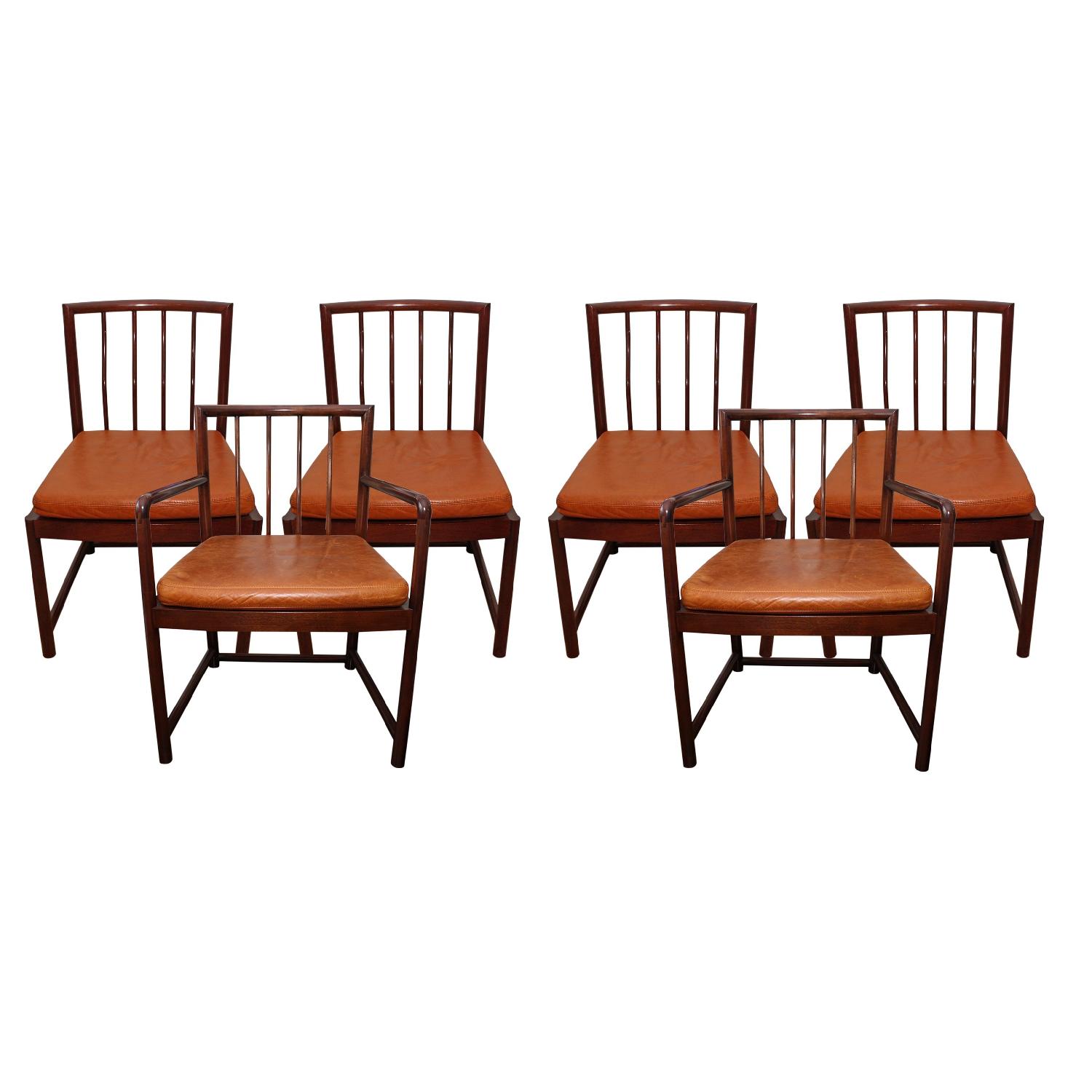 Seller's Notes:Additional Dimensions: Seat Height: 19" Arm Height: 27" This handsome set of chairs upgrades any dining room. Made by luxury furniture brand Bolier & Company and curated by noted designer Drew McGukin, each chair features a well-crafted wooden frame with tobacco-hued attached leather cushions. The set of six includes two armchairs and four side chairs.