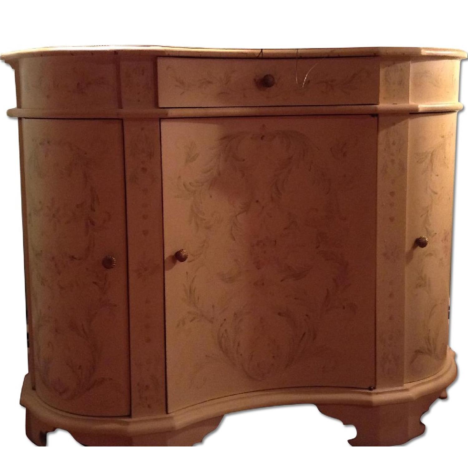 Seller's Notes:Bombé chest of softwood construction, pale yellow finish with delicate branch motif and brass-like fixtures, 1 drawer and 3 doors concealing 6 storage compartments. Some blemishes, both factory-distressed and age. Ideal for media storage, or linens and tableware. Will brighten even the darkest space.