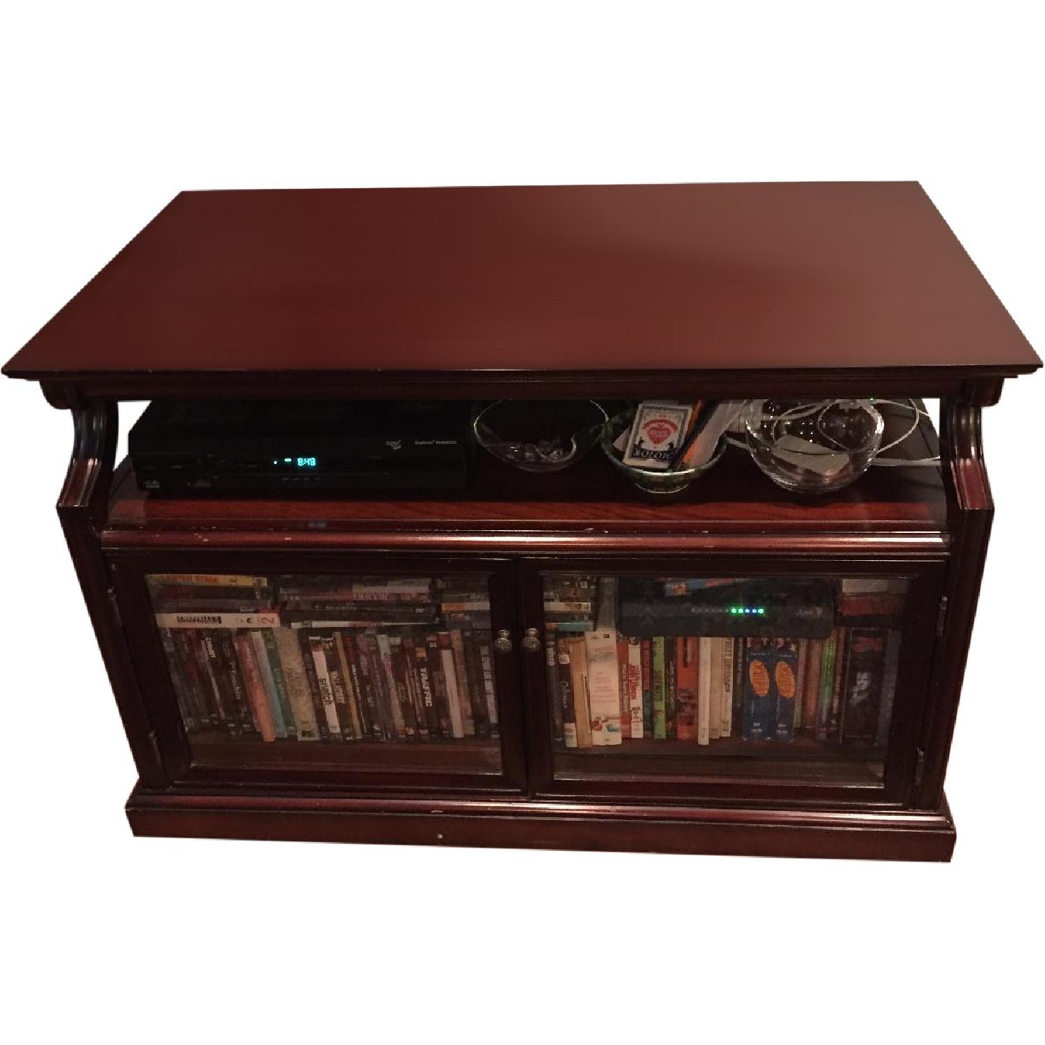 Seller's Notes:This is a beautiful and extremely high quality entertainment stand. Top shelf holds tv and space for a DVD player. Adjustable shelf is enclosed by two glass doors. Finish is vintage mahogany. Elegant and functional - has some knicks and dings as shown in photos. This style is no longer sold via Bombay & Co.