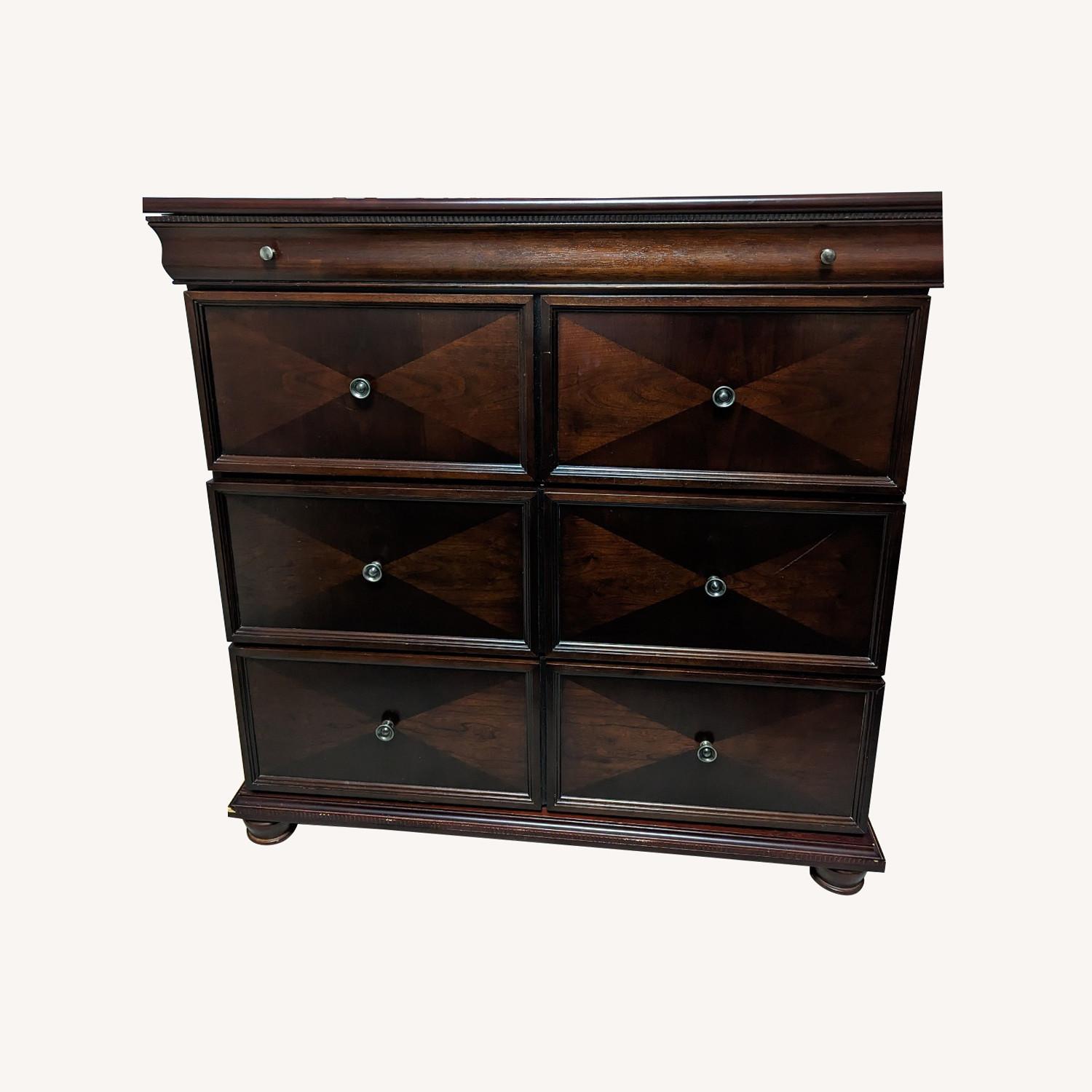 Seller's Notes:This Bombay Company dresser had three large drawers and one shallow drawer. Pretty wood detail in two similar tones of wood on the front with round metal drawer pulls. There are nicks and scratches in spots and a few small spots discoloration as well. This dresser matches a Queen sleigh bed, two nightstands and an armoire also posted if interested in a set.