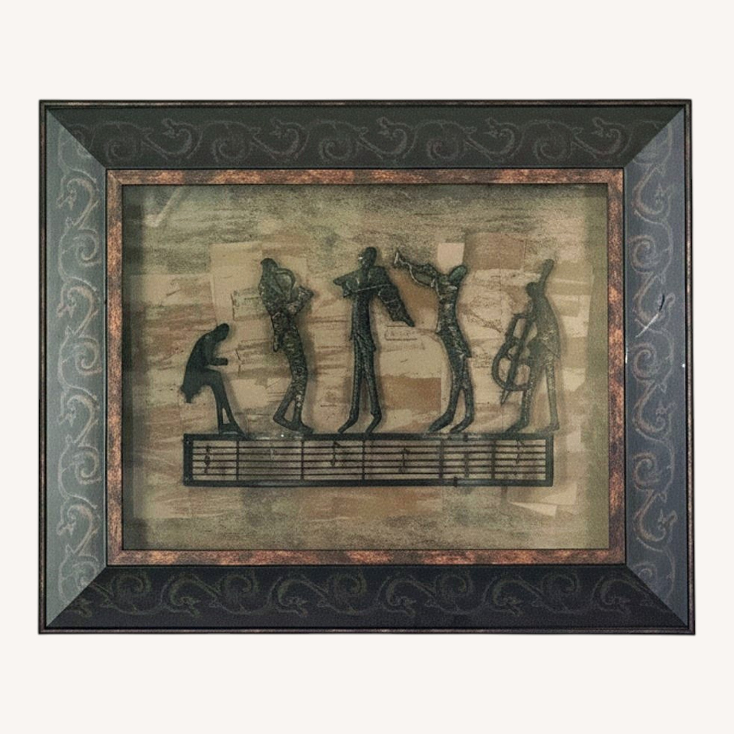 Seller's Notes:Vintage Bombay Company framed metal jazz band wall art. Features dimensional metal silhouettes over sheet music—adds texture and character to any space. In excellent condition. Perfect for music lovers or curated vintage interiors.