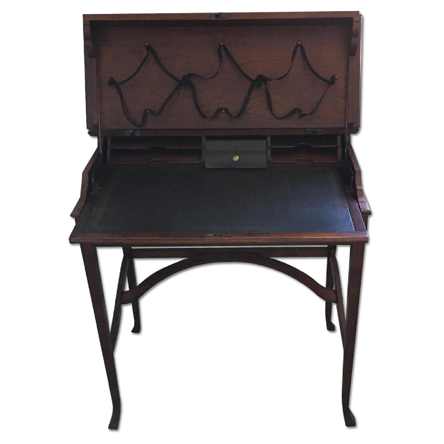 Seller's Notes:Moving Sale - Fall-front hidge desk-on-stand combo with many small drawers and secret compartments with lock. The black strings are elastic to hang photos or documents.