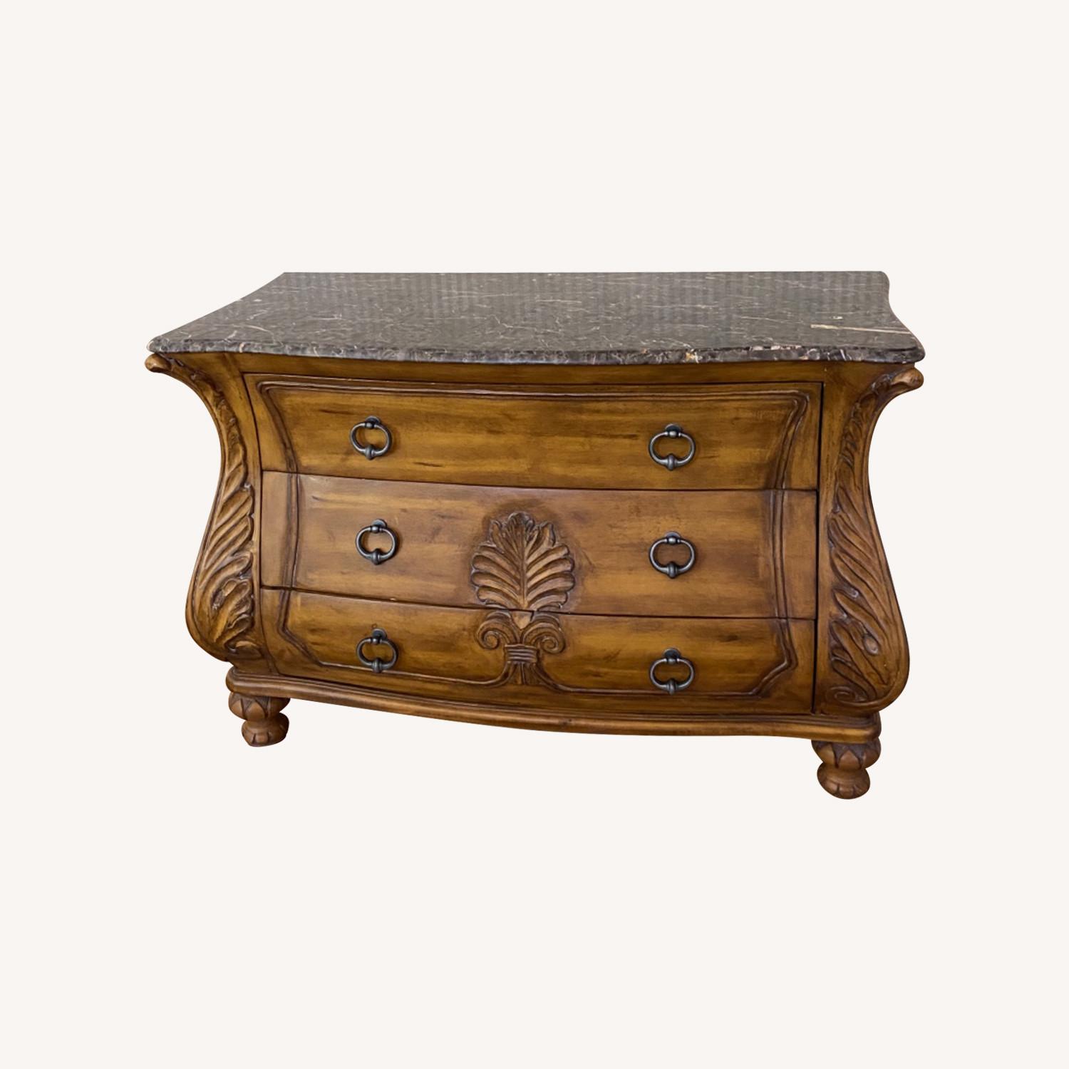 Seller's Notes:Beautifully detailed 3 drawer bombe chest in excellent condition with black/gray marble top. From Collezione Europa. Like new. No chips or scratches. This is a heavy, substantial piece with plenty of storage.