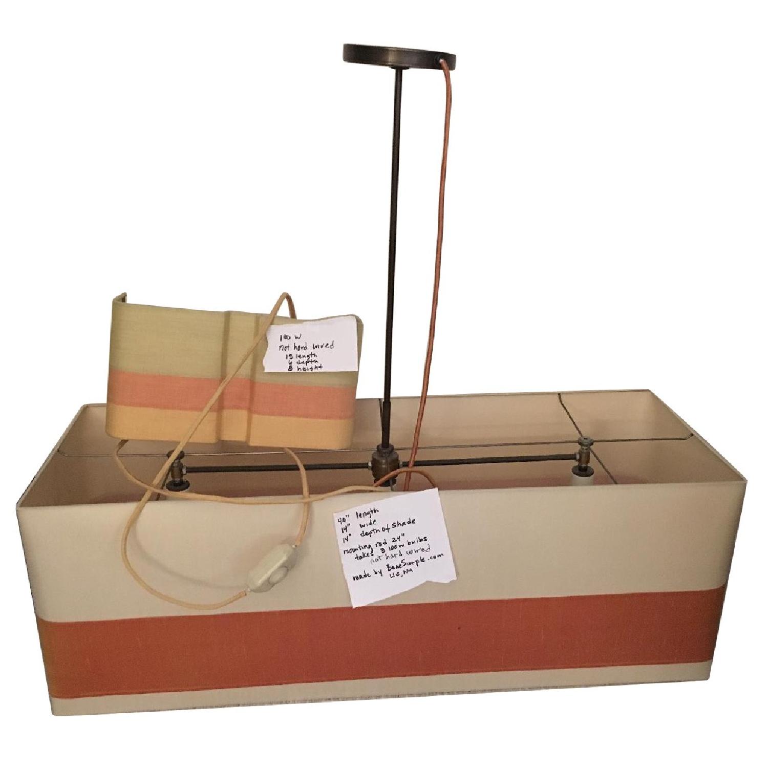 Seller's Notes:2 lights. wall hanging, plug in, cord wrapped in matching fabric. 15 w x 8 h x 7 d ceiling mount, plug in, cord wrapped, on/off switch on cord. 40 w x 14d x 14 inch shade