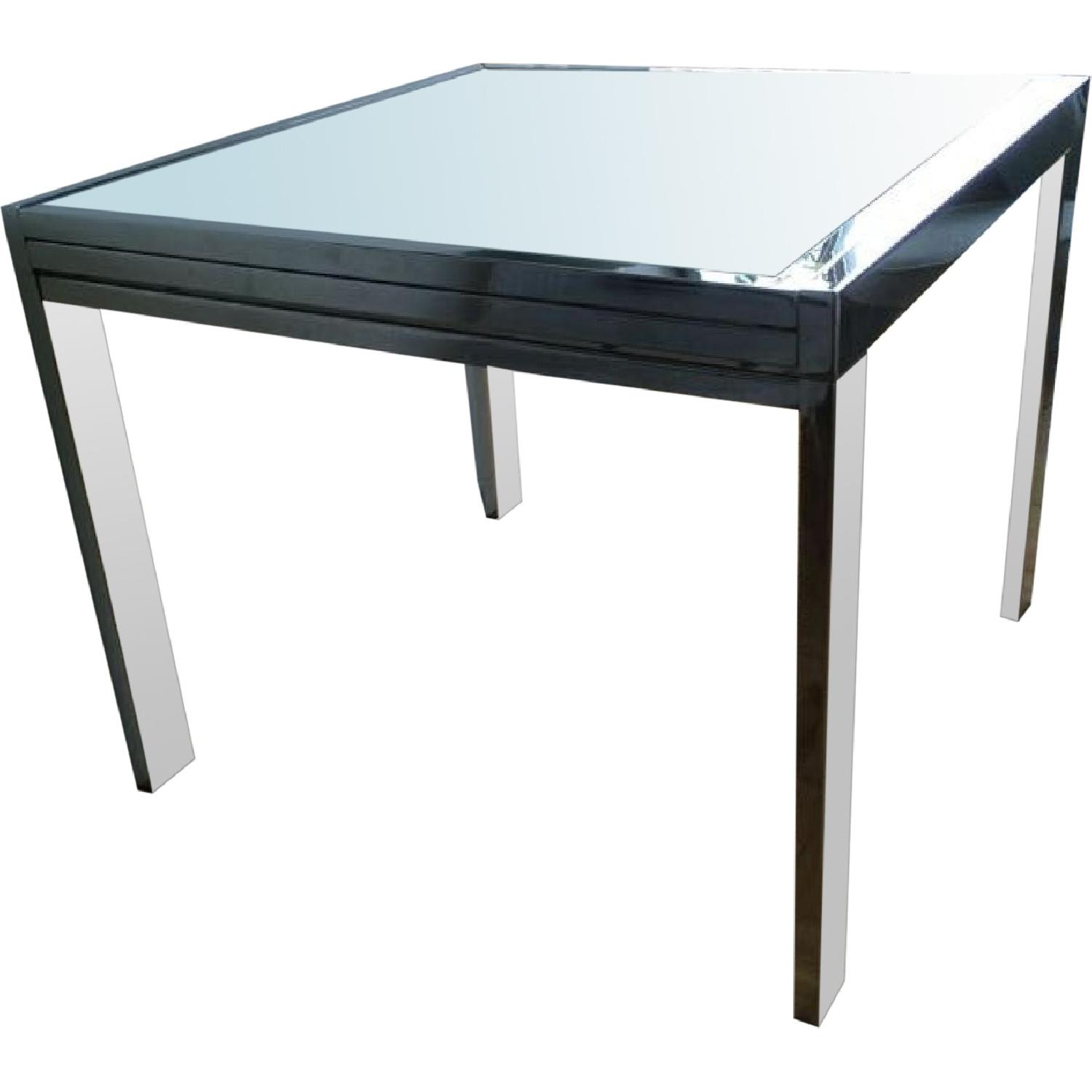 Seller's Notes:Perfect condition! Apartment-sized table easily doubles in size for entertaining. Leg removable for ease in moving. The compact Sky Extension Table is made in Italy by Bontempi Casa. Five star rating for quality and ease of use. The tempered glass top opens with a simple "lift and slide" mechanism. The table smoothly extends to accommodate up to six people with plenty of legroom. When closed, it fits into small dining spaces to comfortably seat four people. Chrome frame with a sandblasted glass top, 35" x 35" closed, opens to 71", 30" high. The extension mechanism ensures that the leaves properly align each time, and that the table provides years of use with frequent openings and closings. Originally $892 at Y Living
