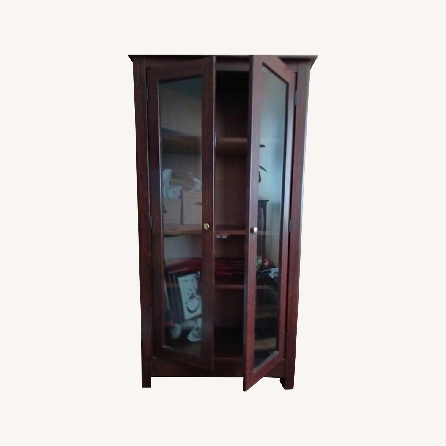 Seller's Notes:A nice finish wood bookcase two-door with clear glass cabinet. It features three adjustable shelves. Good and clean condition. Well maintained in a non-smoking household. Stained on a very small area, however, finish still in tact ( not peeled off). Local pick up please. For a good cause. Best offer. Thanks