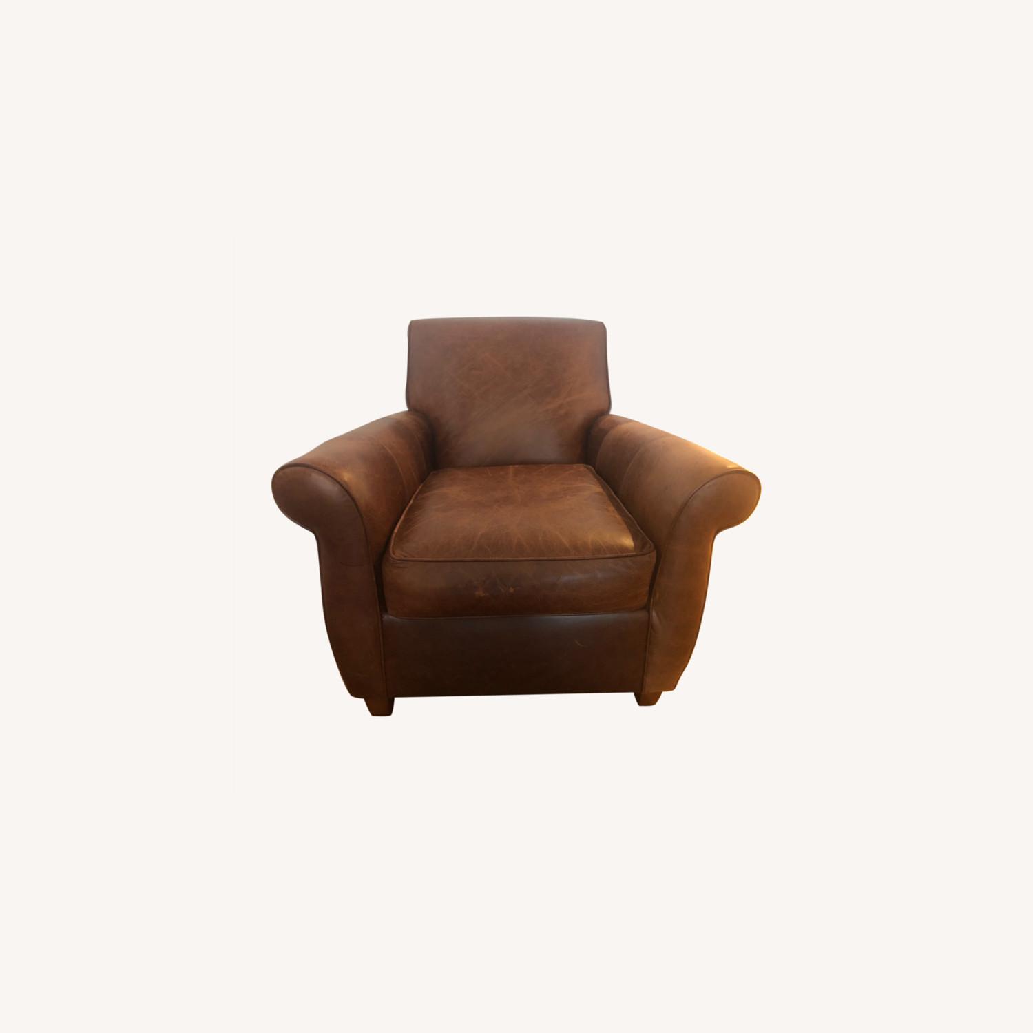 Seller's Notes:Brown leather arm chair originally purchased from Boston Interiors. Had for a few years, not much use. Very comfortable with several good years left! Could also be reupholstered and would look great!