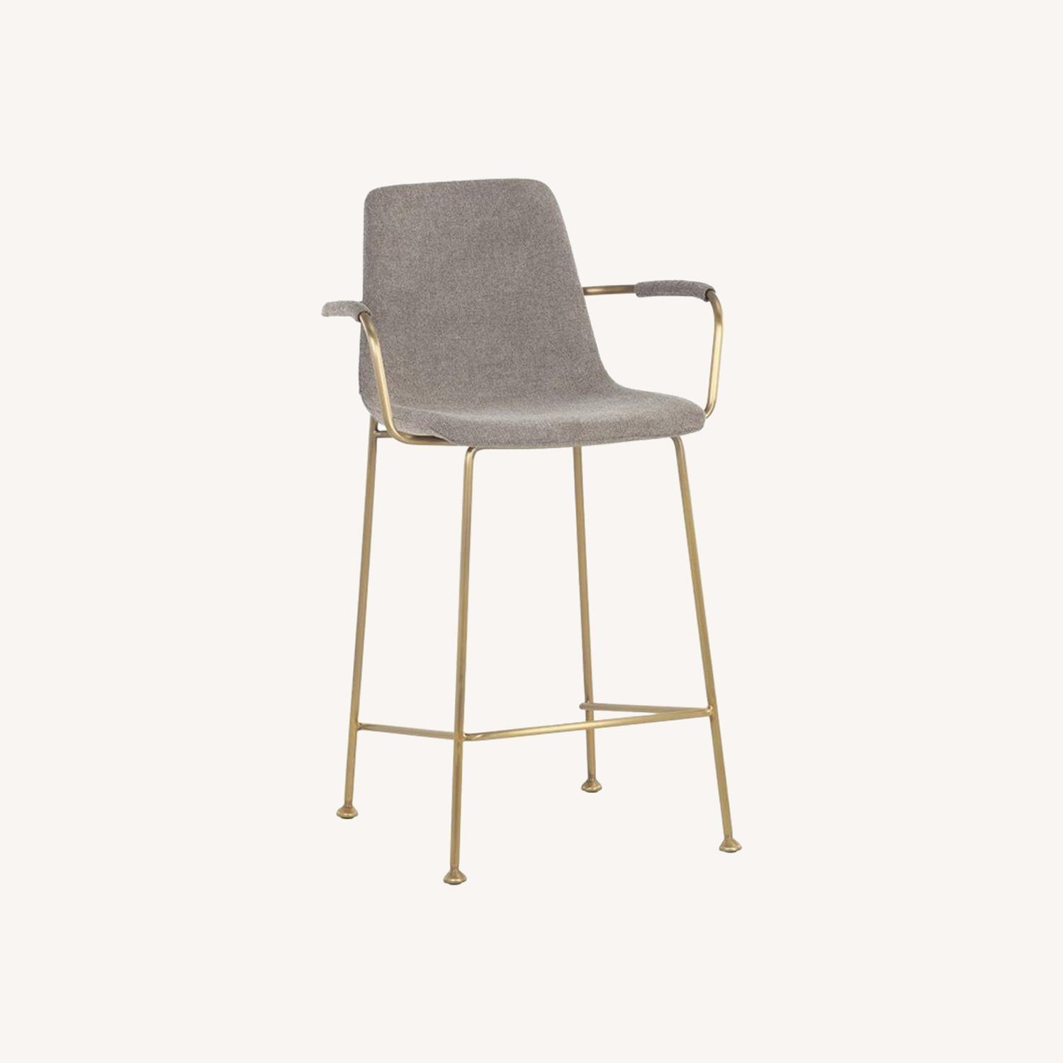 Seller's Notes:Did not use for client project. Brand new in box- (never opened) from Sunpan- a well known, high-quality furniture design vendor. Includes 3 charming counter stools designed with performance grade grey fabric and an exposed gold stainless steel frame. OVERALL DIMENSIONS: 21.75W x 22.00D x 38.25H in ARM HEIGHT: 32.50 in SEAT HEIGHT: 26.00 in SEAT DEPTH: 15.75 in GROSS WEIGHT: 42.99 lb NET WEIGHT: 20.00 lb