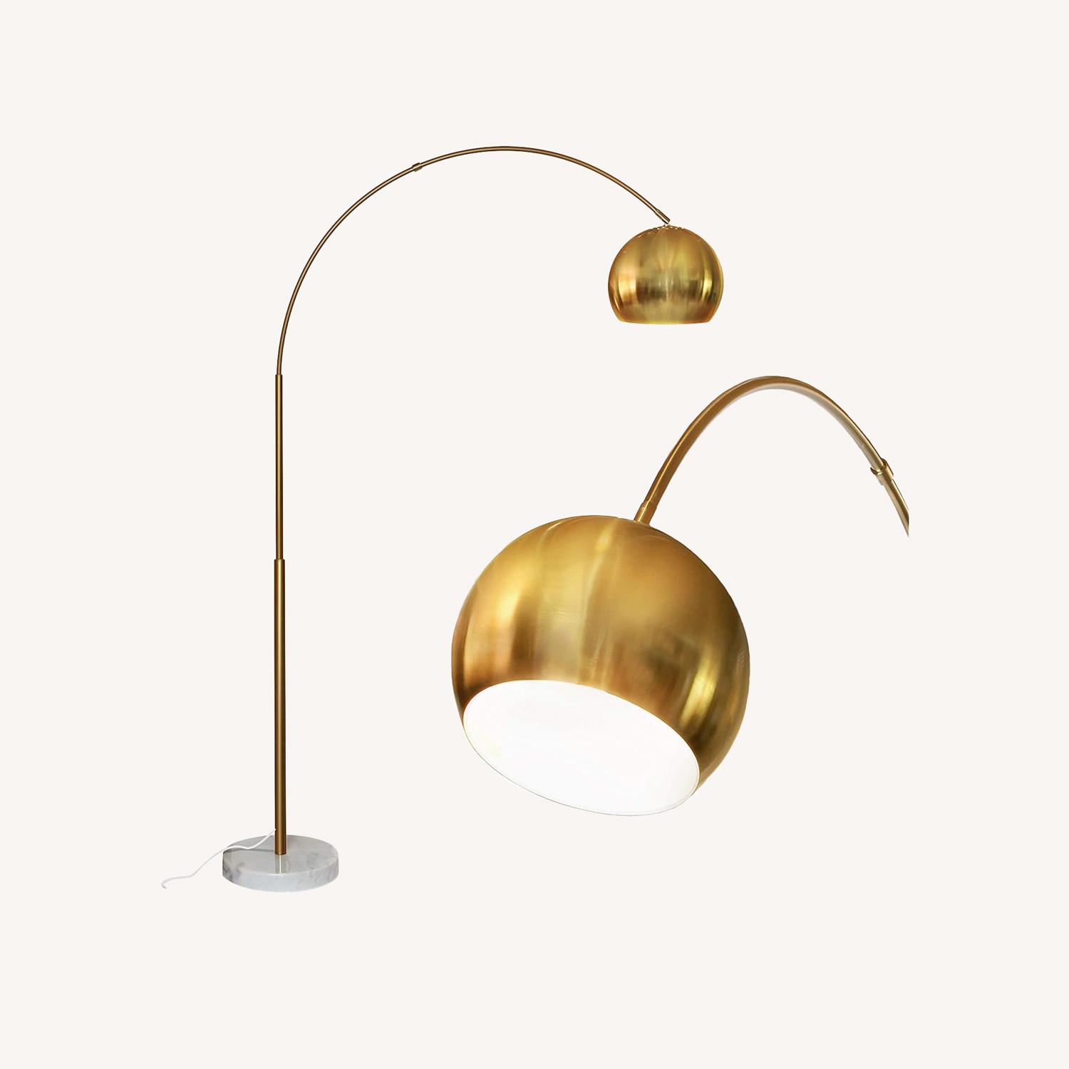 Seller's Notes:I got this amazing floor lamp and it's sadly too big for my space. I've only had it a week or so. It's gorgeous antique brass with a heavy marble base to keep it sturdy. It has a clear cord to plug it in, with foot press switch. The globe is 9" in diameter. Full Details: SOPHISTICATED, CONTEMPORARY ARCH LAMP TO MATCH YOUR STYLE: The Brightech Olivia, with its 9” domed (aka globe) metal shade and trendy gold hue, matches many decor styles including modern, mid century modern and industrial. The arch shape, globe lamp shade and “antique brass” finish add elegance to your home or office, starting conversations and earning compliments. TALL, BEHIND THE SOFA READING LIGHT FOR LIVING ROOMS: This is a great lamp to stand up over the living or family room sofa thanks to its height - 76 inches tall (6’4) . The 2.5" metal base slides easily under your sectional, and you can position the arc to parallel or cross above the couch at any angle. Enjoy overhead light for reading, knitting, and other hobbies. The light fixture can adjust 360° to shine light in any direction.