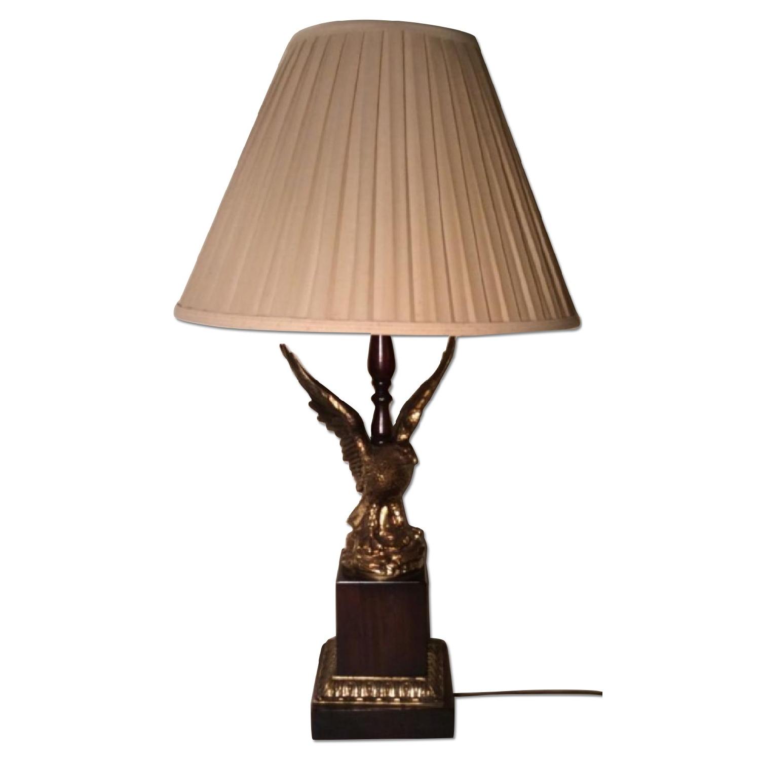 Seller's Notes:BRASS EAGLE TABLE LAMP ON PLINTH BASE Stunning detail on this brass colored eagle. 7"W x 7"D x 33"H. Shade: 18"W.