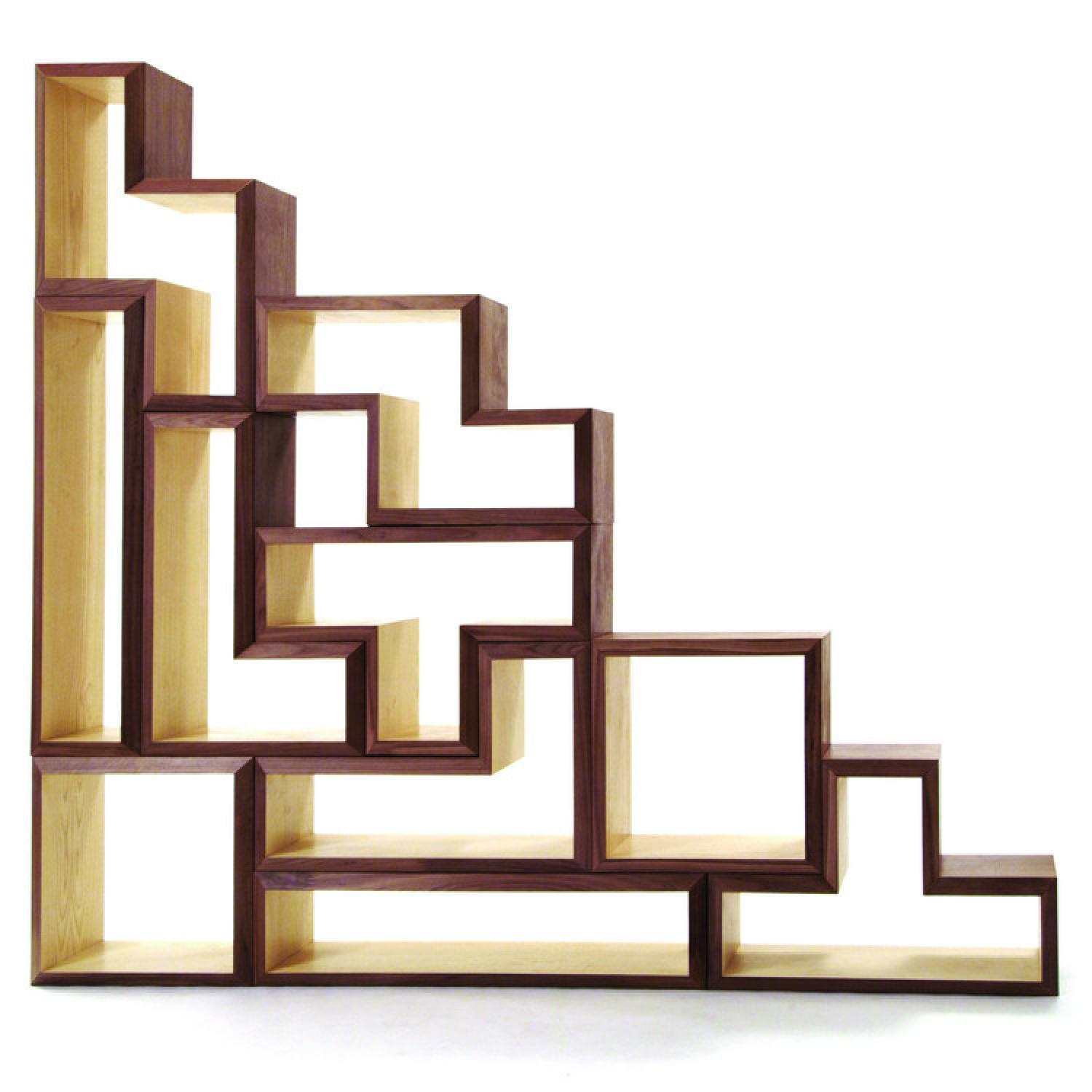 Seller's Notes:This lovely and fun set of 10 open front and back pieces are based on the 1980s falling brick game Tetris, offering near infinite arrangement, storage, and usage configurations. Bought 11 years ago at the beginning of 2009 from Brave Space Design when they were based in Brooklyn, they've been through 3 moves but are in great shape. There are very minor scratches on a couple of the pieces. Hate to let them go, but they're a bit large for my new apt. The size of each "unit block" is 12 inches (where each of the pieces comprises 4 unit blocks in different orientations), and the wall thickness is 1 1/8 inches.