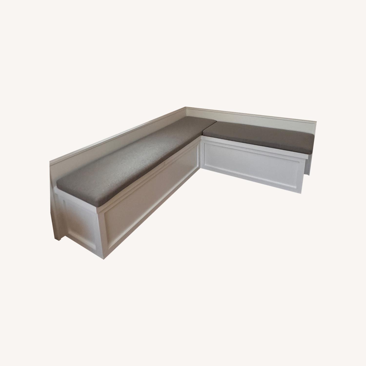 Seller's Notes:Corner L bench, painted with cushion. 48” wide x 19” deep on one side and 64” wide x 19” deep on other side. 18” height