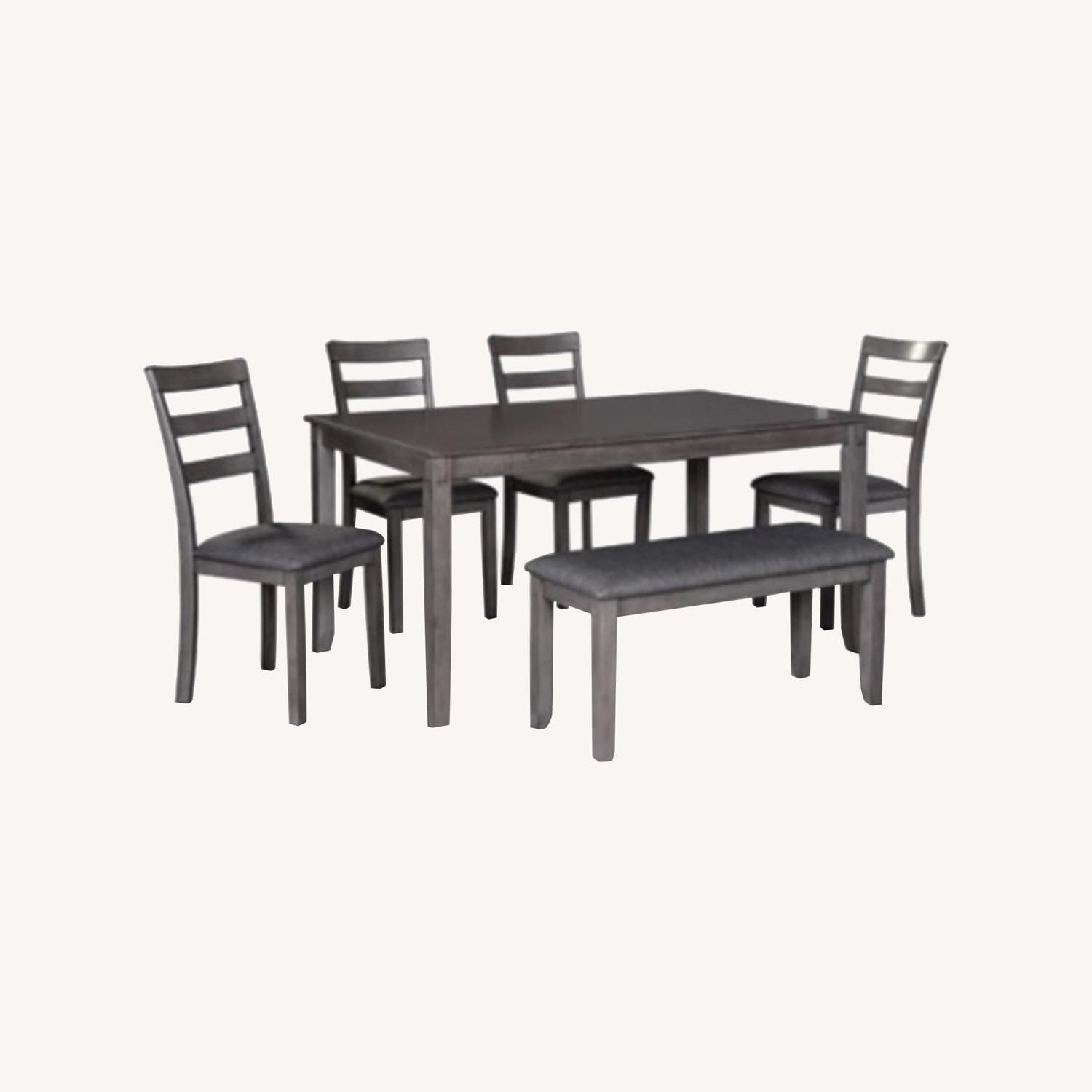 Seller's Notes:This set from Nebraska Furniture Mart includes the table, 4 chairs, and a bench. This dining set is in extremely good condition. There are about 5 small scratches that are barely visible to the eye on the surface of the table and one small scratch on the leg of the table from prior moving.