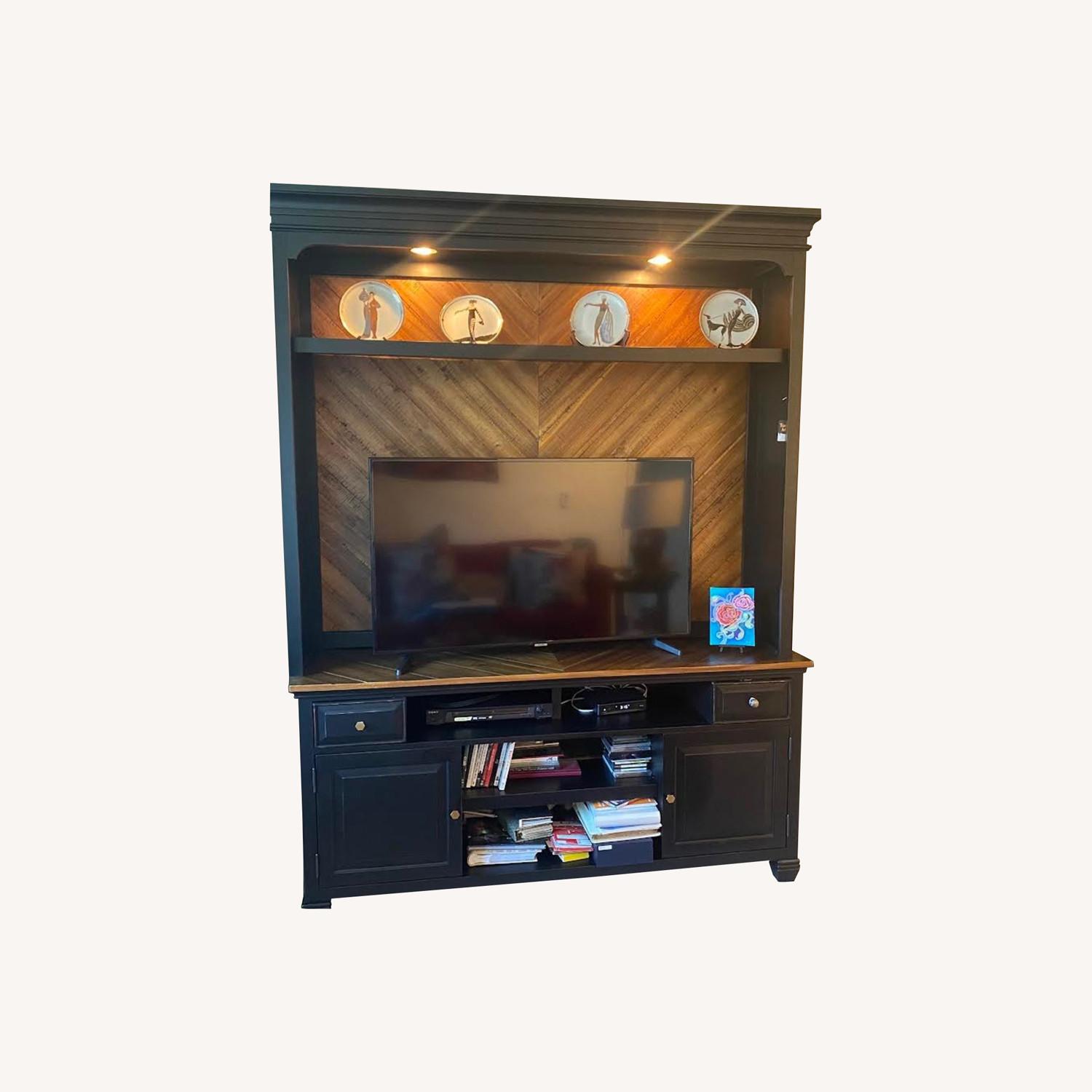 Seller's Notes:Like new entertainment wall with the following features: • Heirloom Black finish • Made of Premium select Poplar solids and Birch veneers • Distressing: Rubbed finish • Designed in the USA and imported abroad • Iron hardware and trim • Gorgeous contrasting wood top Weight 345.91 lb(s) / 156.9 kg -can hold a tv that is 60 inches -Lots of storage space