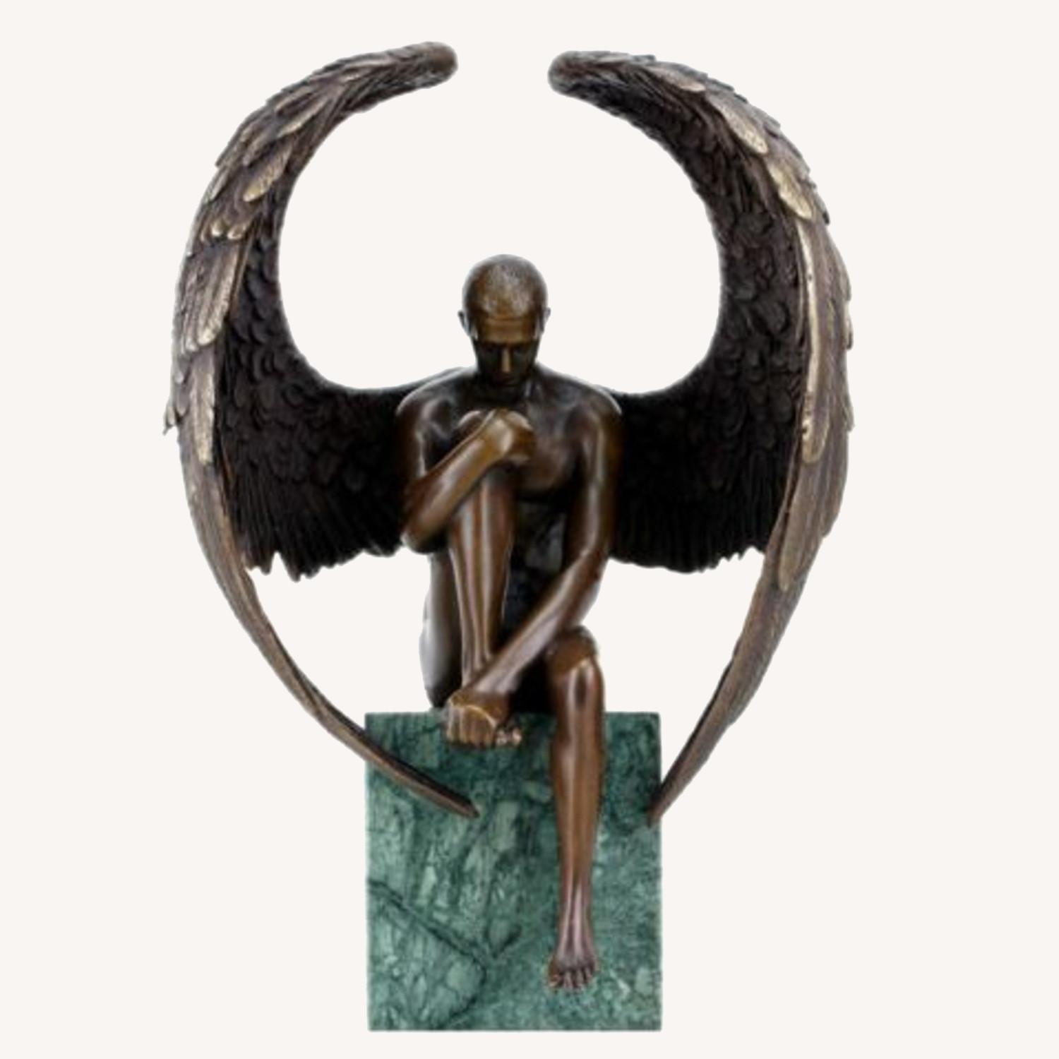 Seller's Notes:An imaginative nude angel figurine sculpture that depicts a male angel sitting on a discreet, green marble base. It conveys a subtle sense of eroticism to the observer without giving too much away. This bronze figurines is created and cast by hand.