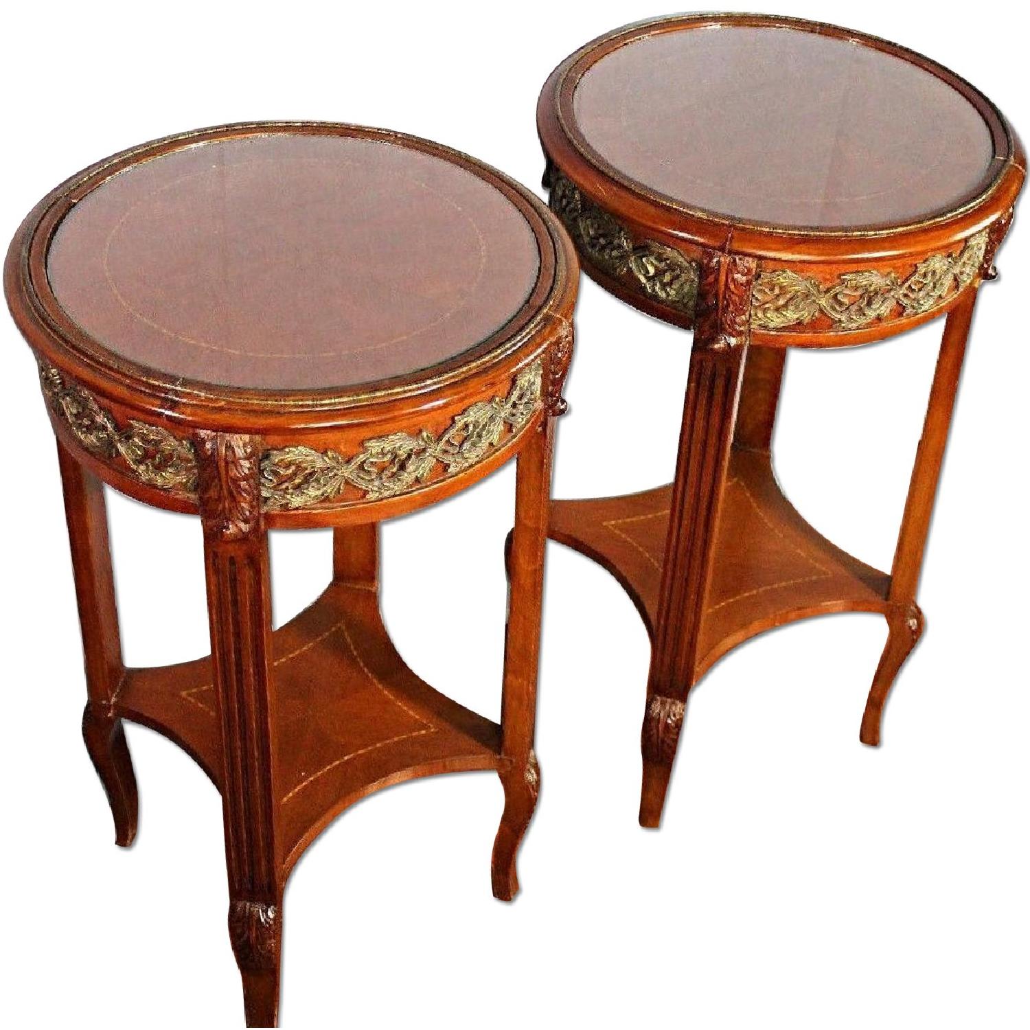 Seller's Notes:On offer on this occasion is a pair of outstanding bronze mounted round side tables / pedestals with glass tops and line inlay. Price is for 2. Measure approx 28" H x 17" W each. Express a distinct style and taste with this pair of elegant end tables that are in a class of their own. Those timeless quality pieces possess all the beauty and majesty you would hope for from the finest examples money can buy. *****Treasure Island Interiors***** Use this multi-functional set as end tables, side tables, lamp tables, decorative display tables, or simply as accent pieces. They can be used to rest antique or designer flower vases, statues or decorative plants, creating a lovely decorative accent, stable and beautiful. Use them in your living room, family room, den and focal corners for an added touch of visual interest. Perfect for any French decorated room or romantic Paris boudoir. Those stunning presentation pieces will blend with practically any decor and will add luxurious touch to any space. Outstandingly versatile and practical choice, those exquisite tables are unique in their structural integrity and perfect functionality. The elegant design and outstanding detail combine to create exceptional pieces of fine furniture, ones that tend to receive comments and compliments as long as you own them. ****Treasure Island Interiors**** Offered in very good vintage condition; minor signs of use consistent with the normal, residential employment they have seen. Some old restorations that do not detract from their beauty or affect their performance in any significant way. The pictures are of the actual items you are purchasing, so please look at them closely to confirm their condition and outstanding appearance, as they are part of the description. Come from a clean, non-smoking, pet-free home. Those fine tables represent spectacular value for money, and we have no doubt they will serve and delight their new owner for many years to come.