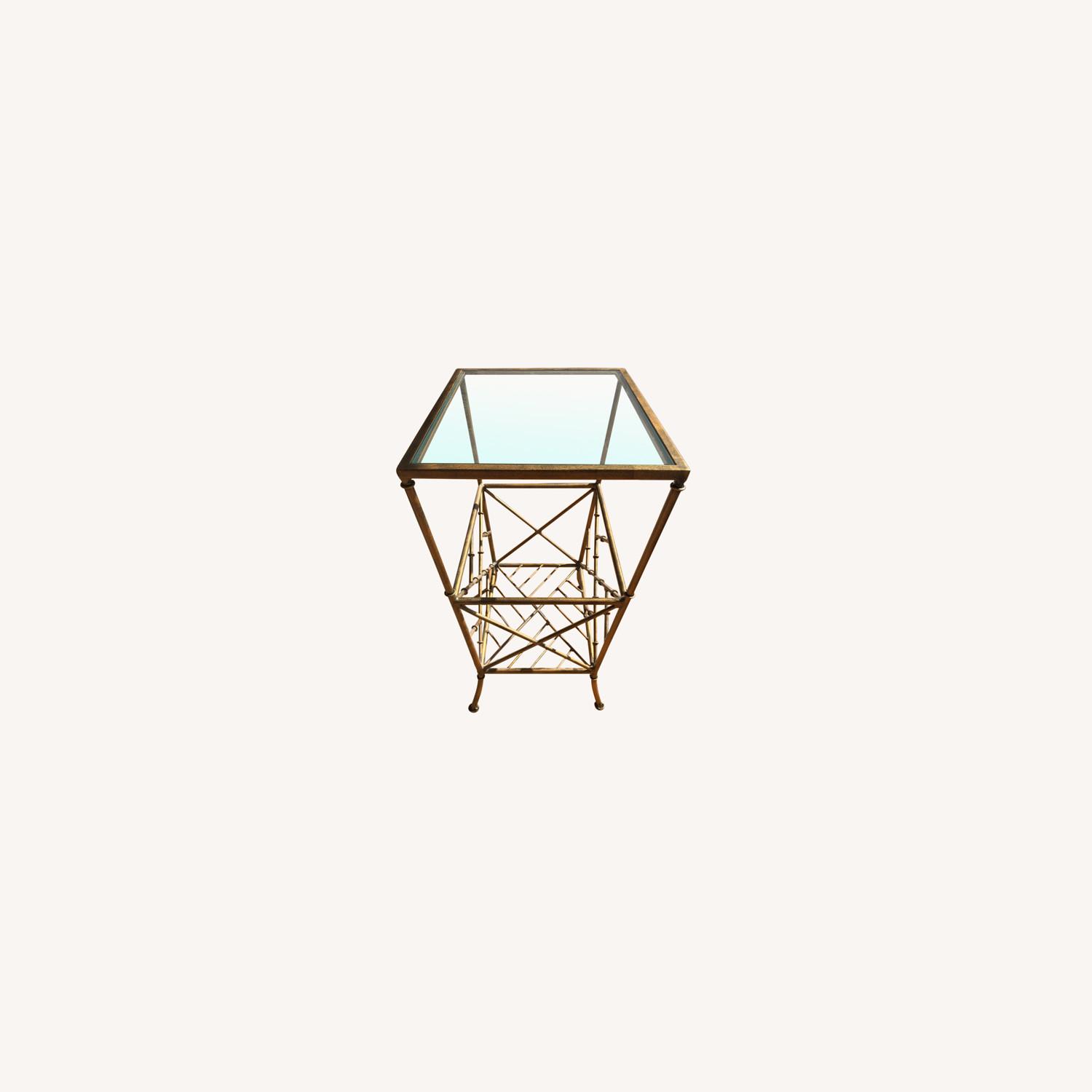 Seller's Notes:Selling my side table after a move - just didn't match my new furniture. It has a glass top and the frame is bronze-colored. The bottom is a useful storage basket. Perfect condition.