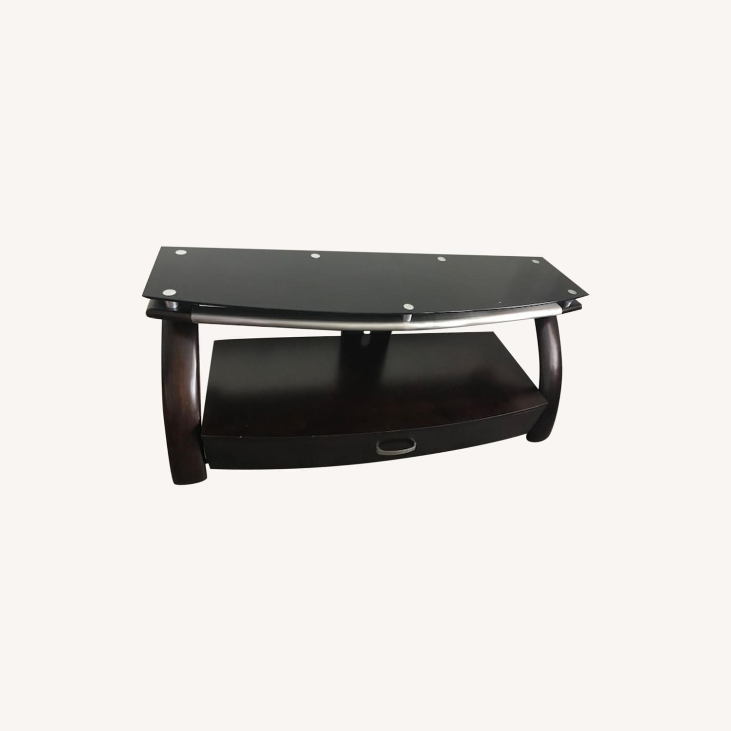 Seller's Notes:Modern design and practical TV console. Size: L:54" x W:21.5" x H:69". Combination of glass top, chrome (steel) and wood. It has 1 drawer and 1 swivel holder to TV on it.