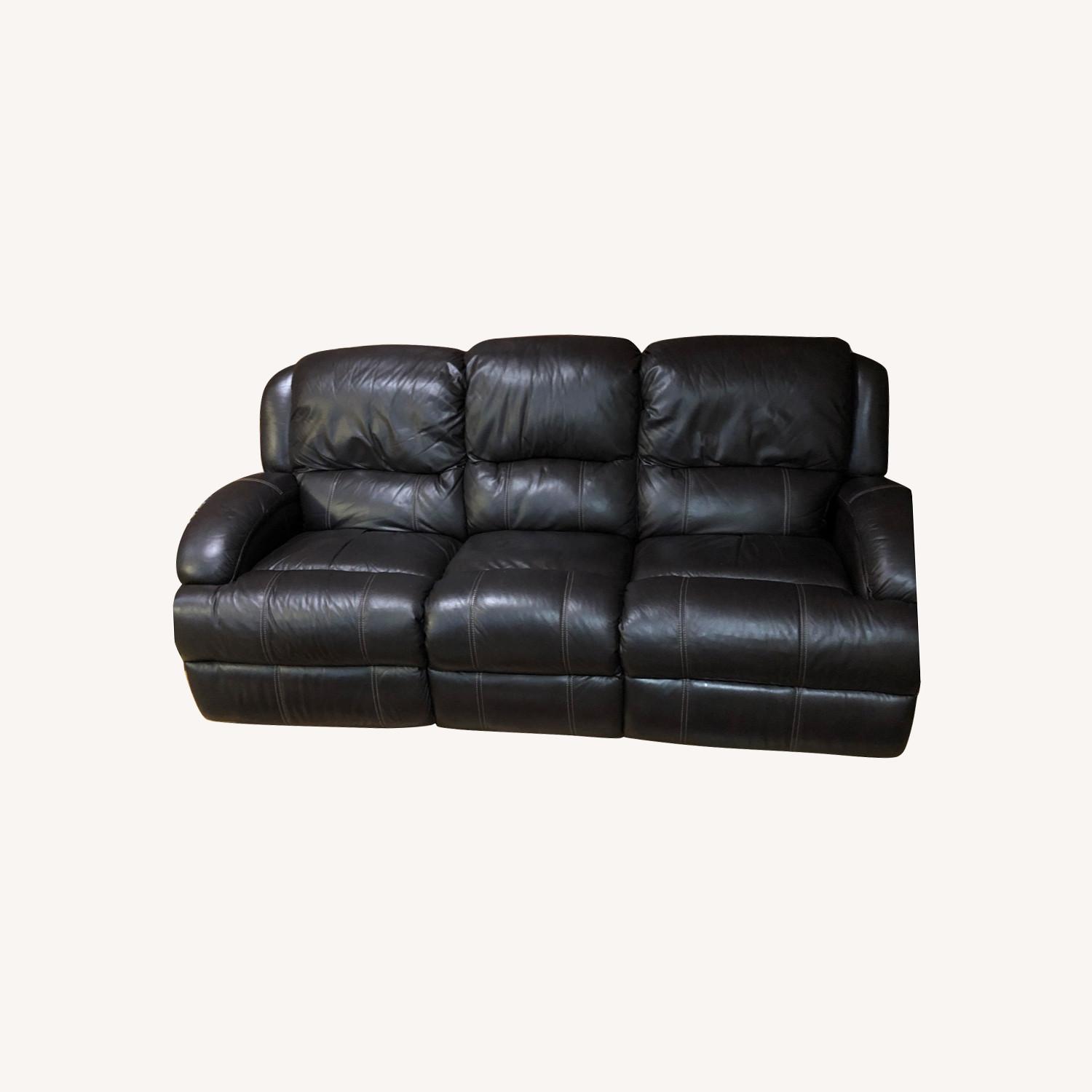 Seller's Notes:Bob's Discount Furniture Power Reclining Leather Sofa. Lightly-used and comfortable seats 4+. Two side seats recline with electric buttons on side. Cushions have retained their shape well with no sagging. Small discoloration dots on arm and one seat cushion (see photos).
