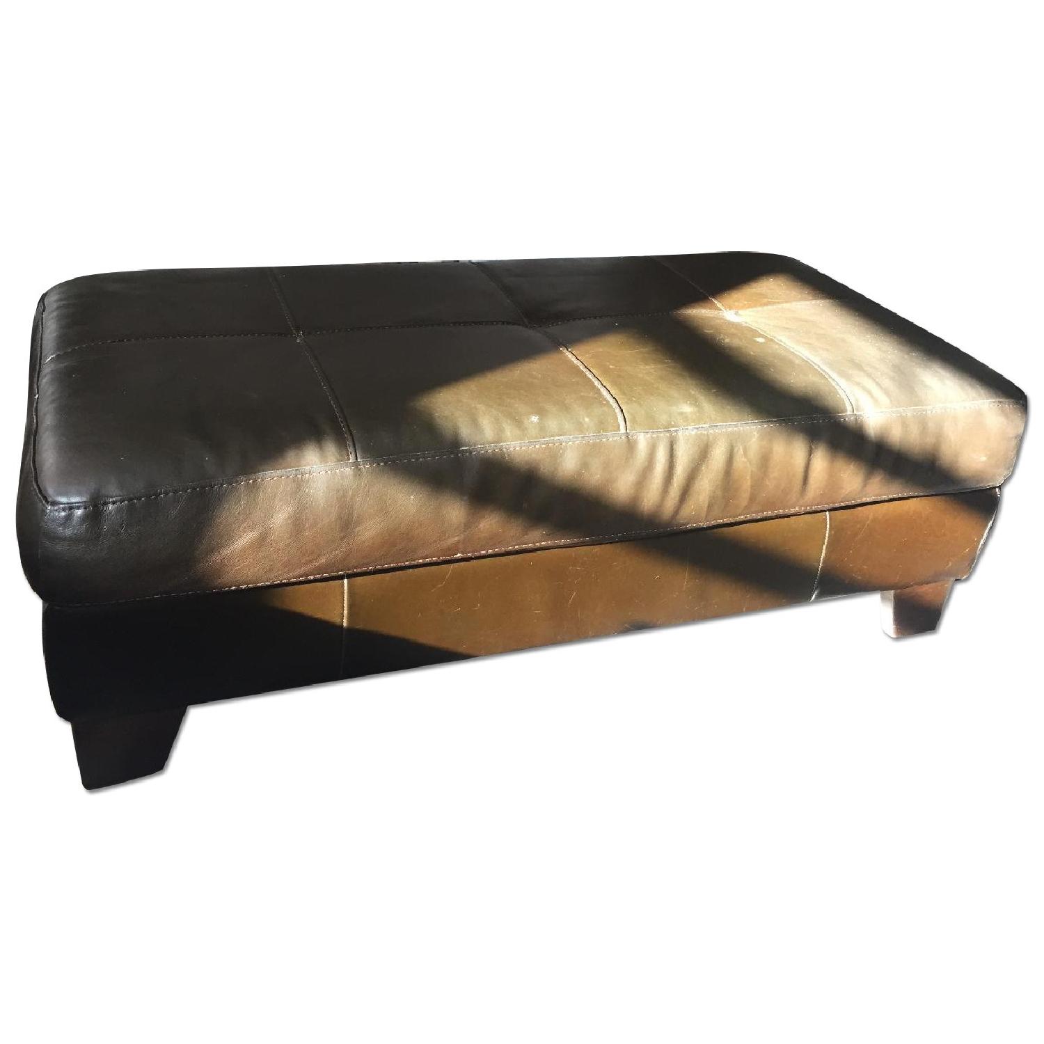 Seller's Notes:Nice dark brown ottoman. Works well as a coffee table with a tray ontop or as a bench for extra seating. Small tear in the cloth underbelly as seen in photo. one or two nics in the leather, from normal usage. Not noticeable. comes from a pet free, smoke free home.