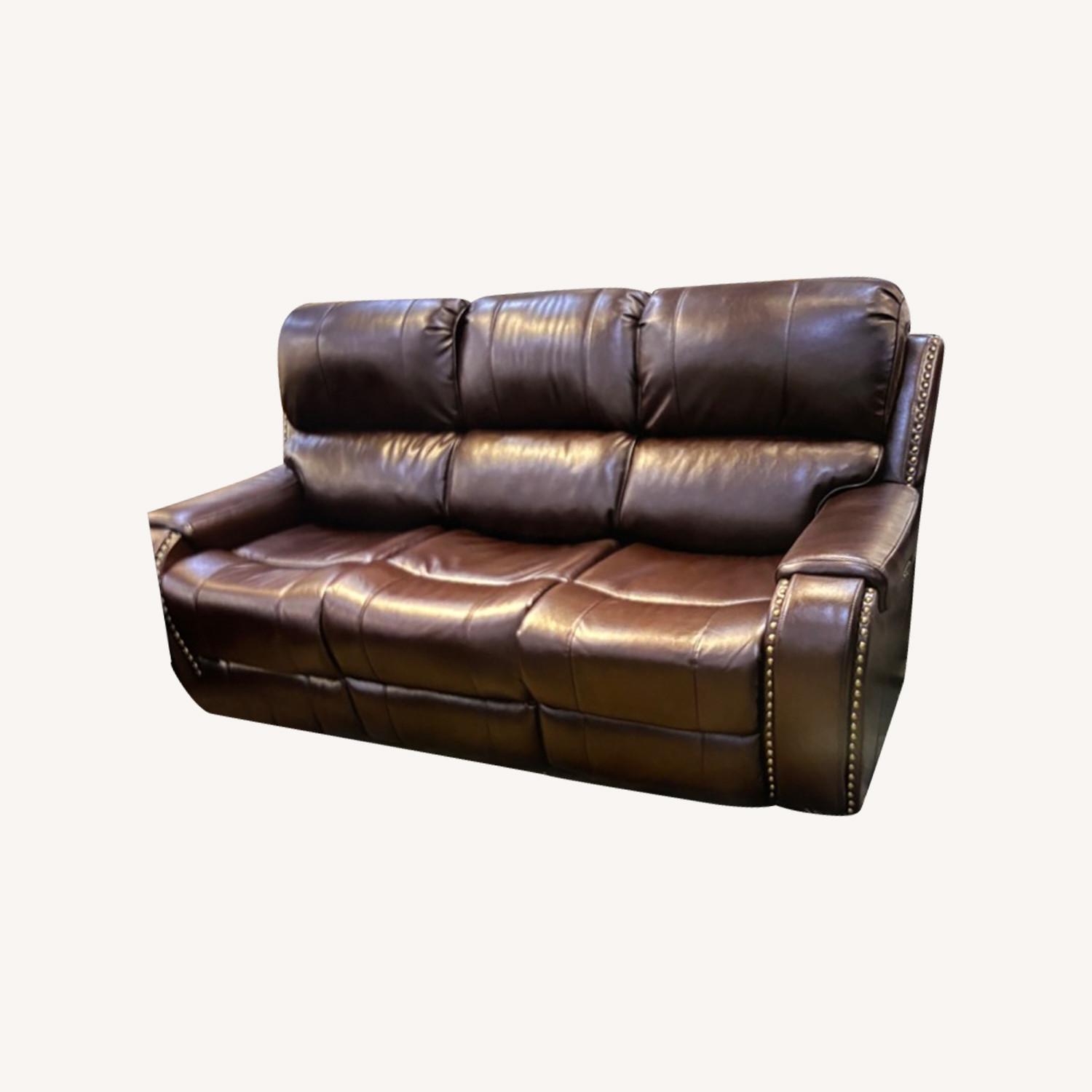The Keily sofa features a leather-like cover with baseball stitching. The center back cushion folds down to reveal a pop-up USB charging station with 2 electrical outlets, 2 cupholders and an upholstered pouch for remotes or magazine storage. Antiqued-like brass nail head trim for upscale style.
