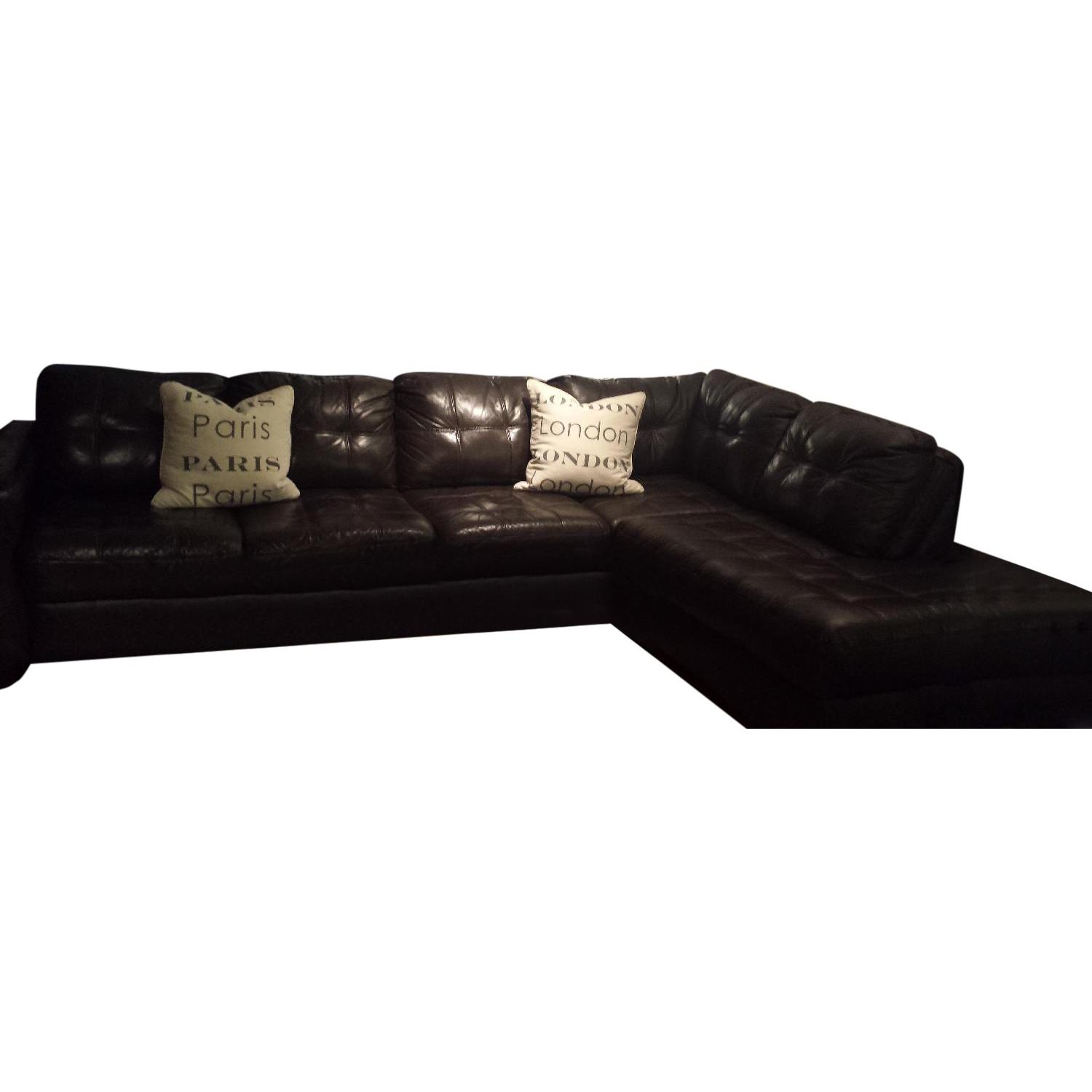 Seller's Notes:Beautiful chocolate-colored leather sectional sofa. Not only is it super comfortable, it has elegant detail, with tufted cushions, side, and back of couch. Dark brown color not well shown in the pictures due to poor lighting. Used for only 2 years, but slightly too big for my new living room. Measures approximately 10 feet by 7 feet with 3.5 foot depth. Sectional is 2 pieces, which attach (latch included). Smoke-free bug-free home.