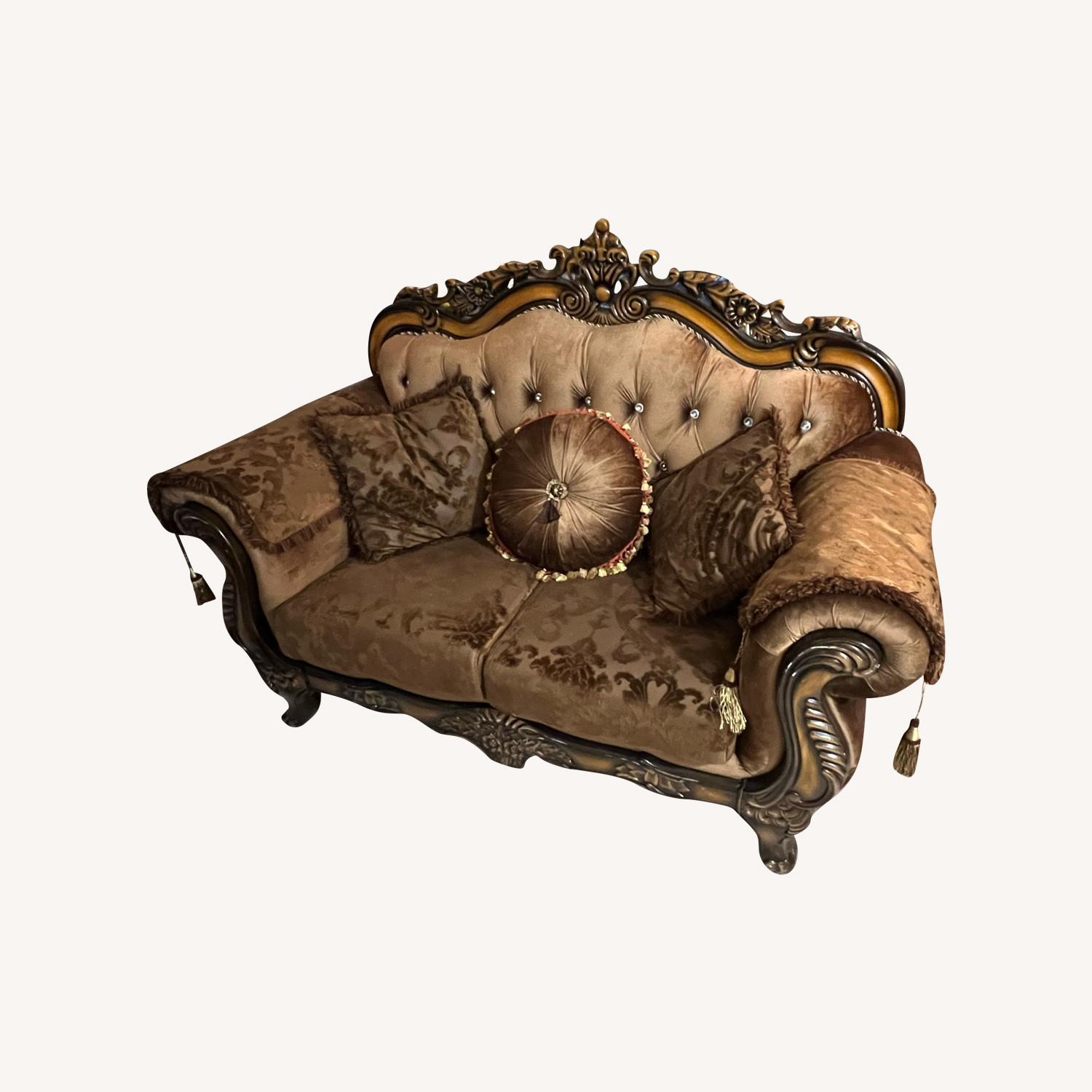 Seller's Notes:Small fingernail sized stain on one pillow. Slight crack in the left armrest. Otherwise minimally used and in great condition. I believe the brand is Samara, but unsure.
