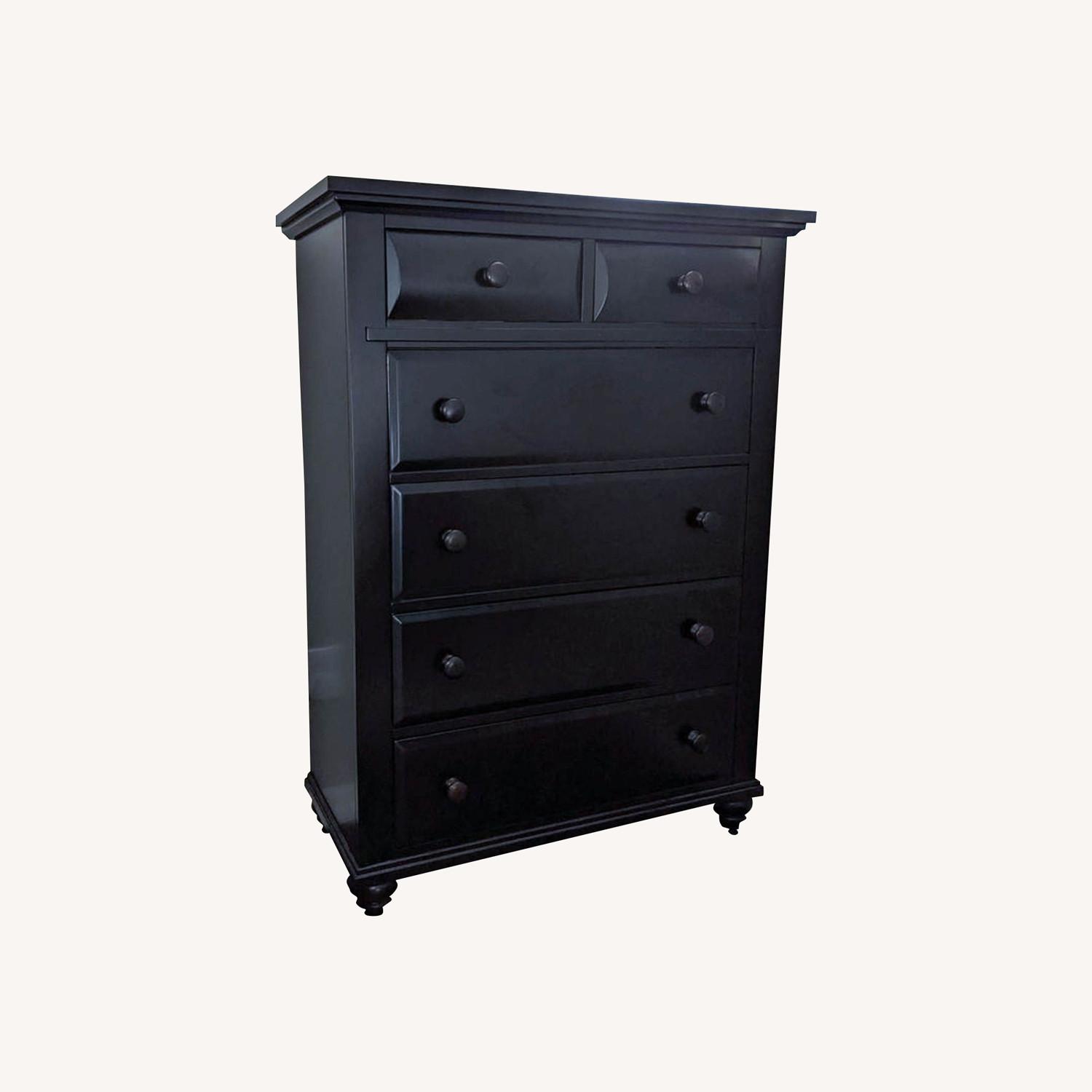 Seller's Notes:Description: This chest of drawers by Broyhill features 6 drawers with dovetail joinery on metal glides with wood knobs that match the black finish of the entire piece. . Brand: Broyhill . Material: wood. Retail price: $797. Gently used - any blemishes or damage will be included in the photos. #SKU: 2017865. Tags: wood,veneer,transitional,contemporary