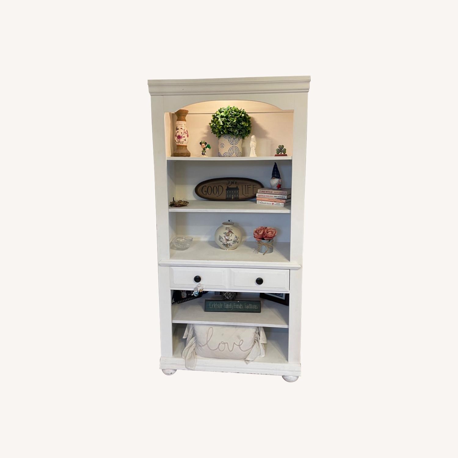 Seller's Notes:Set of 2 Bookcases. Broyhill Fontana Collection. Very good condition looks like new. Each one has a light on top, 2 adjustable shelves on top with 1 adjustable shelf on the bottom and a draw.