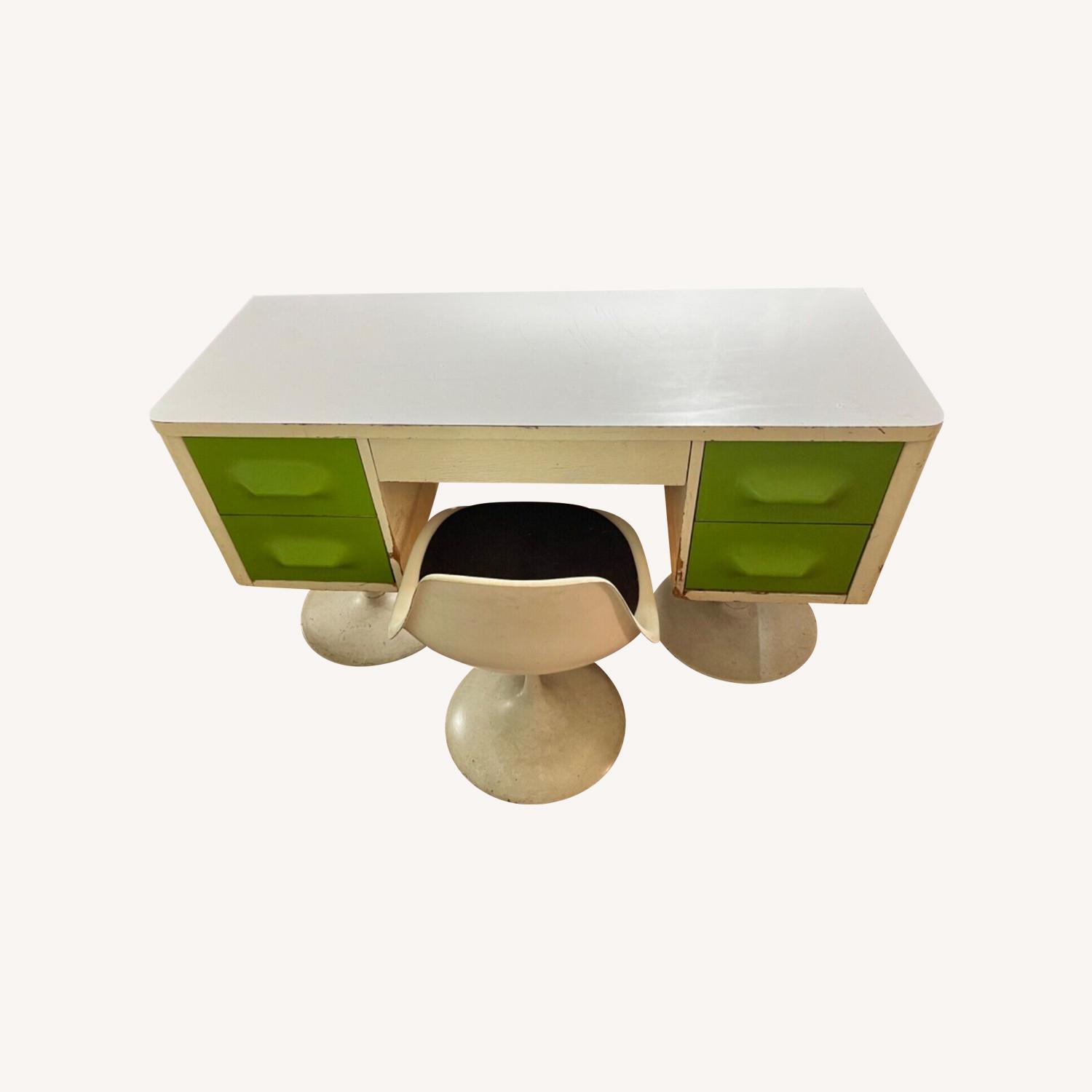 Seller's Notes:RAYMOND LOEWY Style BROYHILL Desk. Modernist molded plastic lime green drawer fronts. White Saarinen style tulip pedestal bases. White laminate top. Crafted from molded vibrant green plastic drawers encased in white lacquered wood frame. Size: H 30" x W 52" x D 20" Middle drawer: H 2.5" x W 20" x D 15.5" Side Drawers: H 6" x W 10.5" x D 15.25" Chair: H 18" x W 18" x D 20" (seating 15")
