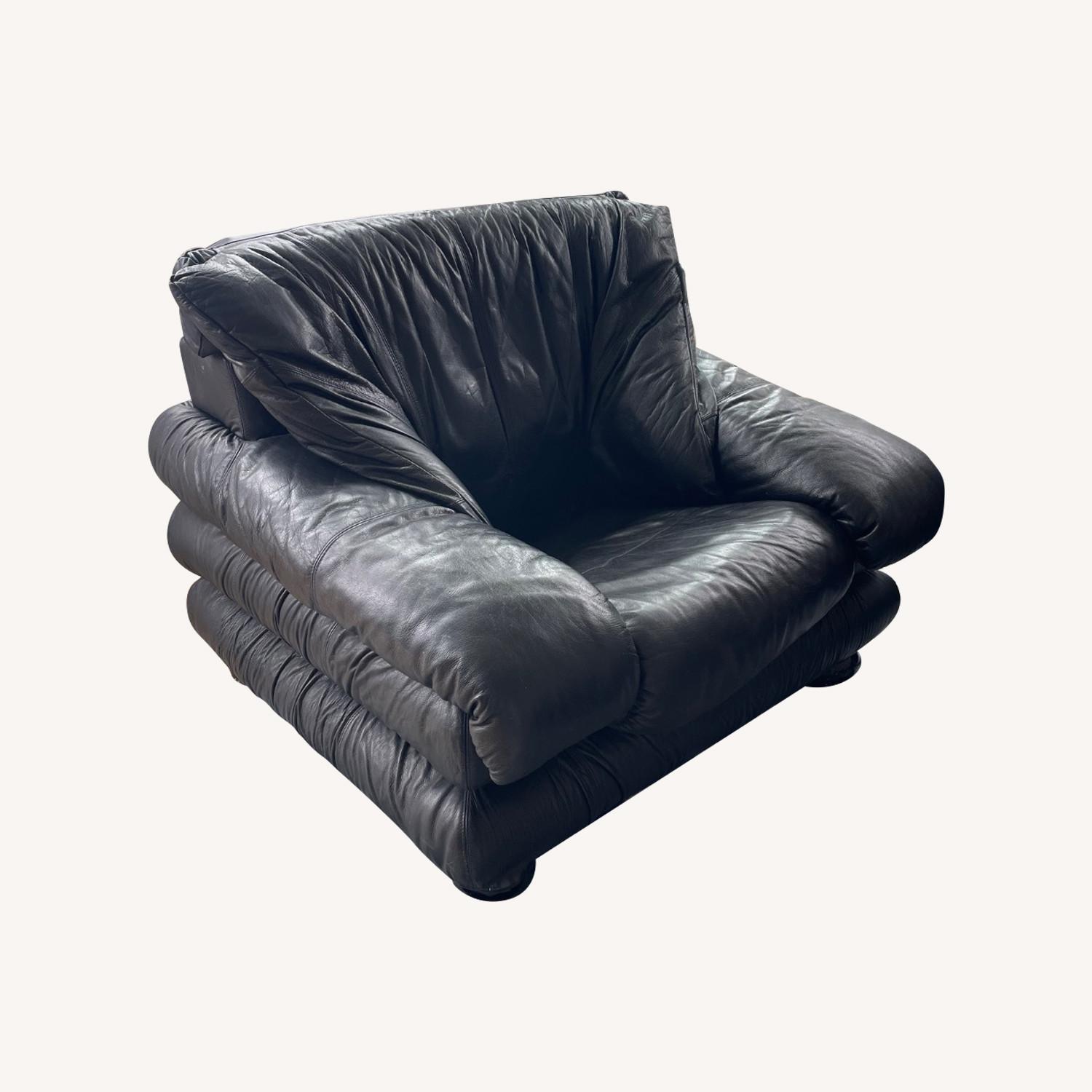 Seller's Notes:Send you best offer. Ideally needs to go this weekend. Black leather armchair with a bold, bubble shape and brutalist style. Real leather, good condition — no major rips or tears. Cushions are super comfortable. Legs might benefit from a touch-up or paint in a few spots, but overall solid. Dimensions: • 40” wide • 40” deep • 33” high (backrest)
