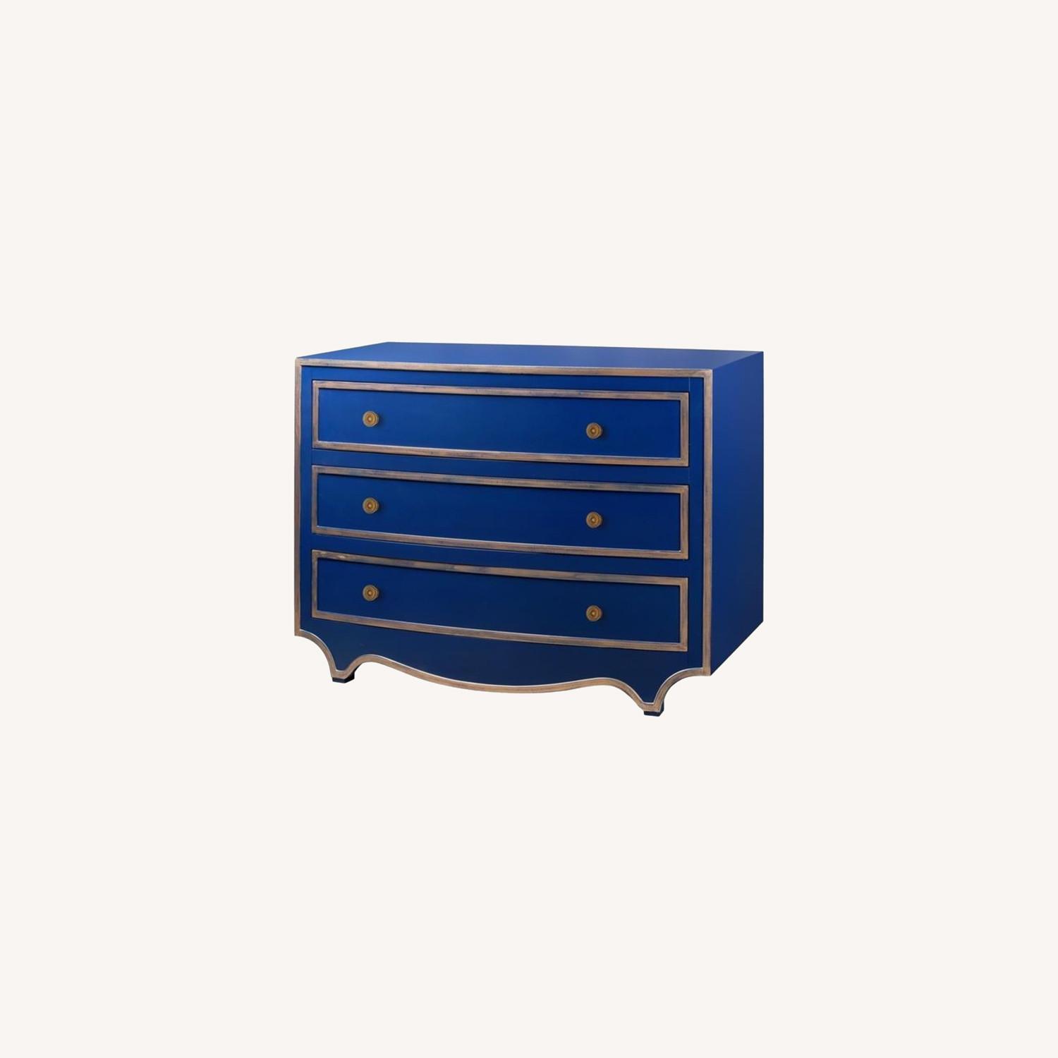 Seller's Notes:Beautiful, lacquered wood dresser from Bungalow 5! This deep blue dresser has a gold finish. So chic! As you can see from the photos, there is some light water marks (it looks a bit like bubbling underneath the paint) atop of the dresser. The dresser is so dark though that this is not very noticeable, and also adds charm to this shabby chic styled dresser. There's also some minor wear, but definitely does not take away from the beauty of this piece. The inside is pristine, and has shelf lining that I've added to enhance it's charm. Drawer Depth: 15.5" Tallest Drawer: 4.5" Shortest Drawer: 4.5"