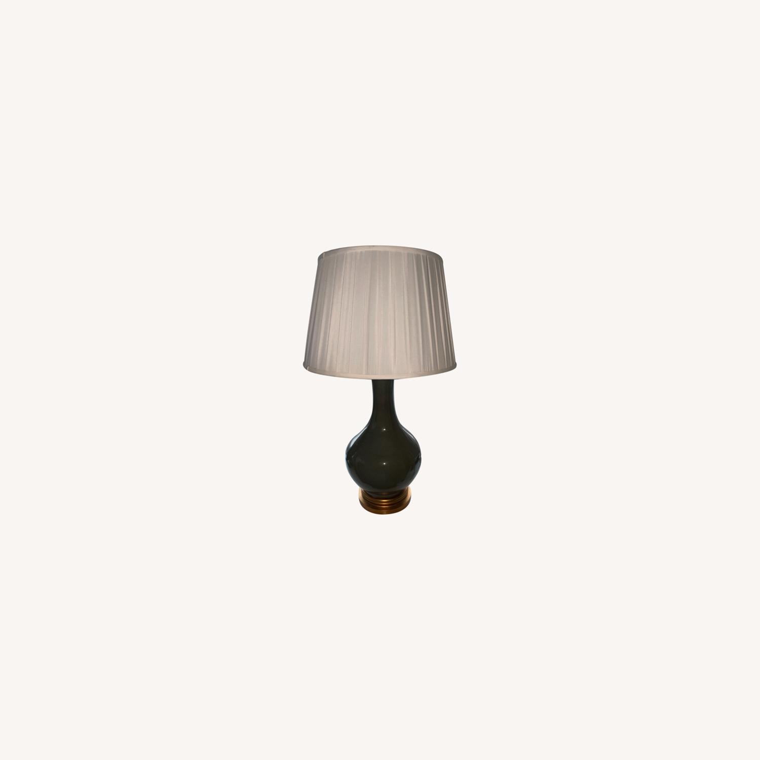 Seller's Notes:Lamp color base is a deep jade green. Porcelain: pleated silk shade gold leaf base Dimensions 18 x 35.5H to Finial Discontinued style, hard to find. Excellent condition.