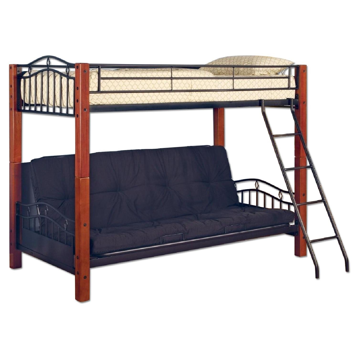 Seller's Notes:This lovely bunk bed will be a nice addition to the youth bedroom or spare bedroom in your home. The piece has a charming casual style, with black metal tube ends featuring a gentle arch and diamond motif. Metal side guard rails will keep your child safe on the top bunk, while an attached ladder makes it easy to get up and down. Rich medium wood posts at each corner soften the look. A futon below can be used as a sofa, or folded down to a full size bed when guests arrive, helping you create a multi-purpose space in your home. The top twin bed and futon can be separated and used individually to suit your needs and change with your family. Add this pretty bunk bed to your home for a warm and inviting look that everyone will love.