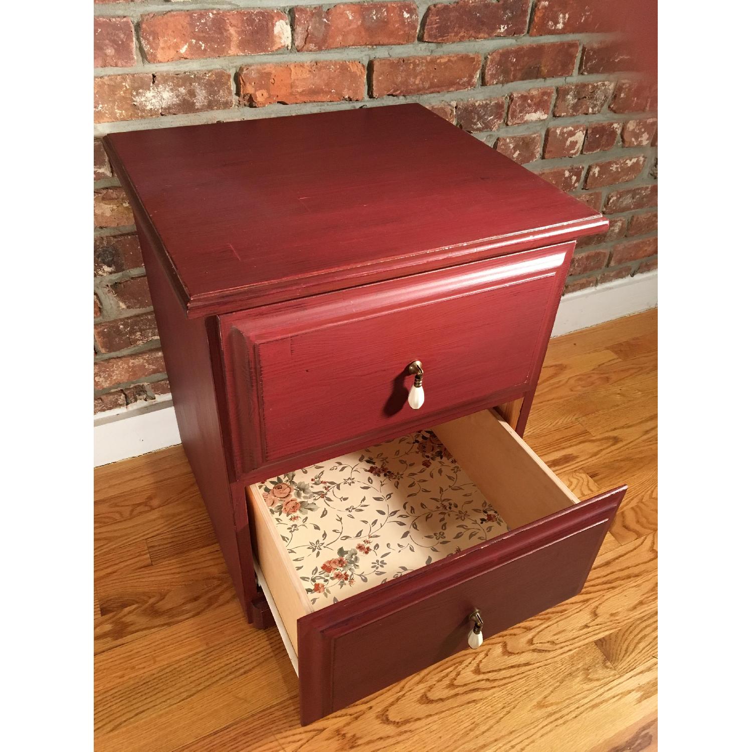 Seller's Notes:This restored bedside table has a brand new finish, brand new hardware, and brand new drawer lining. Finished with subtle distress, it has a black undercoat, classic burgundy paint, and a low luster clear coat that has a slightly rustic appearance but is velvety smooth to the touch. Brand new drawer pulls from Anthroplogie. Very cute piece with a vintage look/feel! Perfect for the bedroom or as a couch-side table.