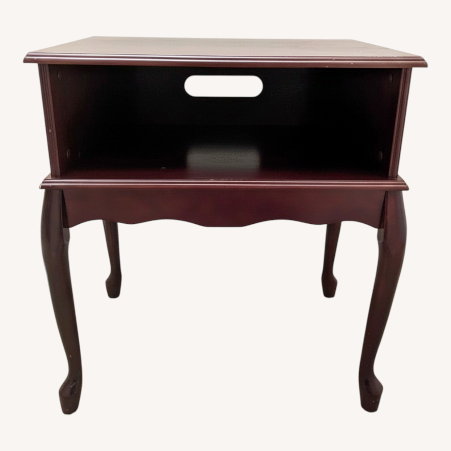 Seller's Notes:This burgundy wood side table is very sturdy. Because of the convenient opening in the back, it can be used to house a computer printer or other wired electronics, keeping the wires neatly hidden. Minor scratches on the legs and some scratches on the top (see picture).