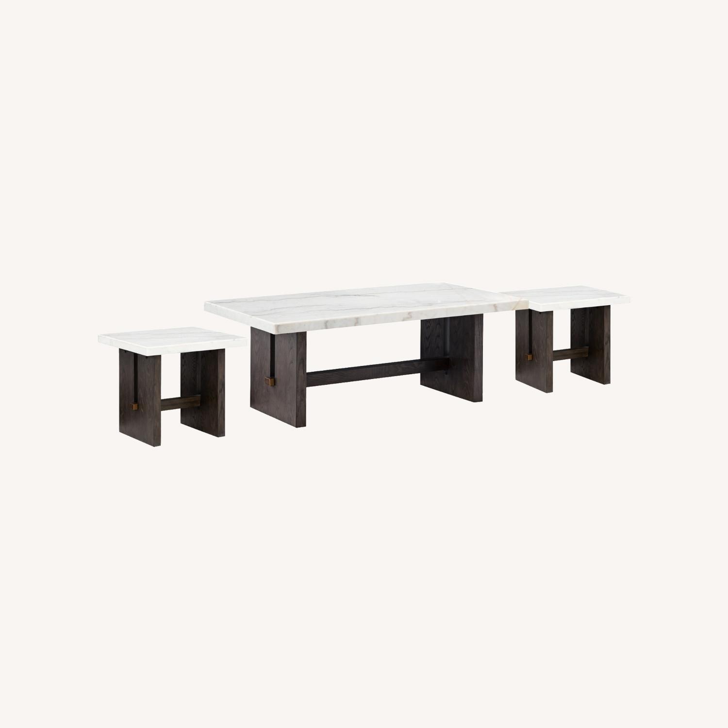 Dressed to thrill, this simply stunning occasional table package offers a high-design look at a down-to-earth price. Ultra-sleek lines are accentuated with a dark waxy brown oak finish that’s so easy on the eyes. Clean-lined and modern, the plinth bases and natural marble tabletops showcase quality craftsmanship and attention to detail. This set is the perfect centerpiece for a living room or family space, with a timeless look that's made to last.