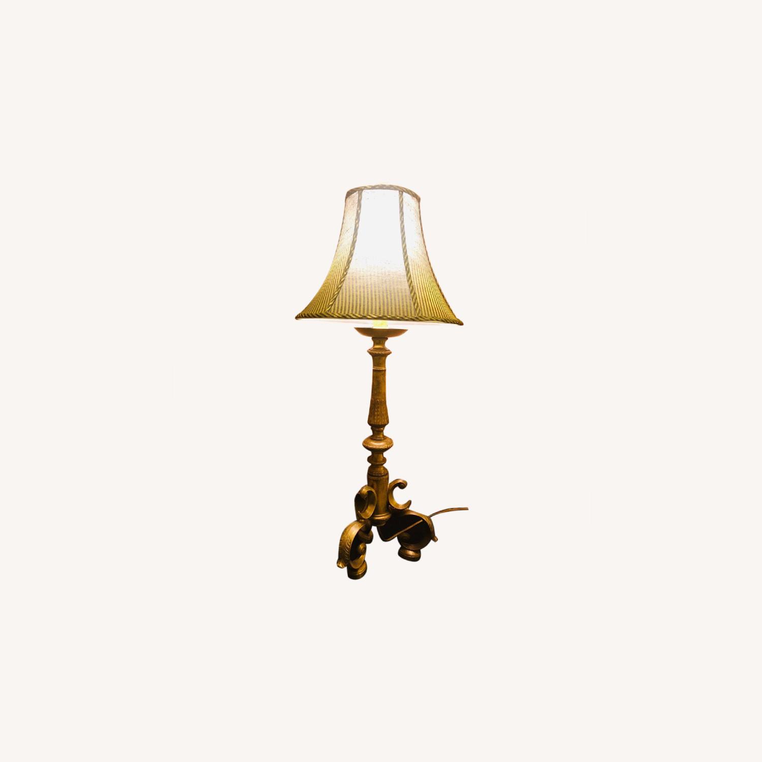 Seller's Notes:This beautiful lamp has been with me in several homes over the past 20 years. I believe I got it from Ballard Designs but do not remember for certain. The base is solid and sturdy and is a burnished almost 'distressed' gold look. The height is 33. 5 inches. The base takes up 9.5 x 9.5 inch space on a table. The bottom of the lampshade is 13.75 inches. Despite it's age, it is in the same great condition it was in when I bought it.