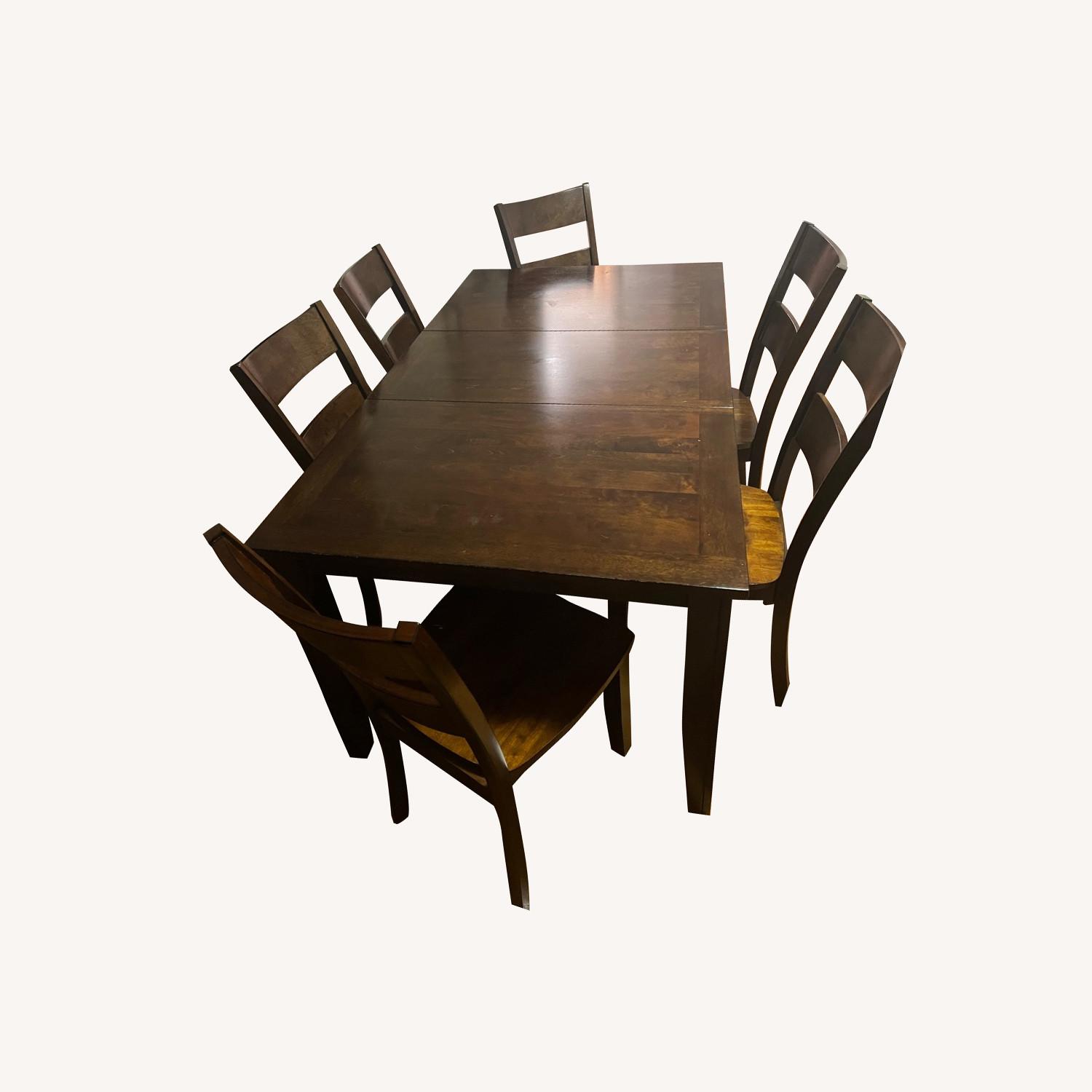 Seller's Notes:Gently used dining set for large families or homes that like to entertain large groups! The table can either sit 6 people or easily collapse in the middle to become a 4 person table. Very versatile and sturdy. 4-5 markings on the table top that Can be sanded out and polished.