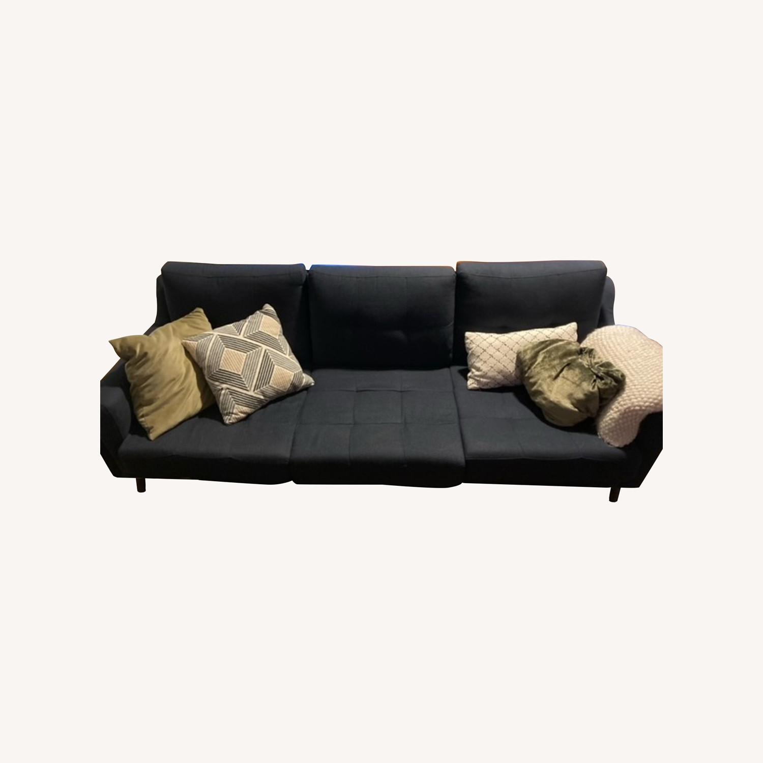 Seller's Notes:Sturdy, comfortable, and modular, so you can add or remove sections, as your lounging needs change. Quickly breaks down into easy-to-carry components, and comes back together again seamlessly -- all without tools. Sleek, mid-century modern look, with a USB port in the corner of the couch, so you don't need to get up to charge your phone. Walnut legs, navy blue fabric, sloped arms, and cushions that are reversible for the choice between a tufted or smooth look. Comes from a home with a cat, but smoke-free and child-free, and the couch is in excellent condition. No tears, no rips, no stains, no smells. Fully disassembled and ready to load into a car, if you want to pick it up yourself.