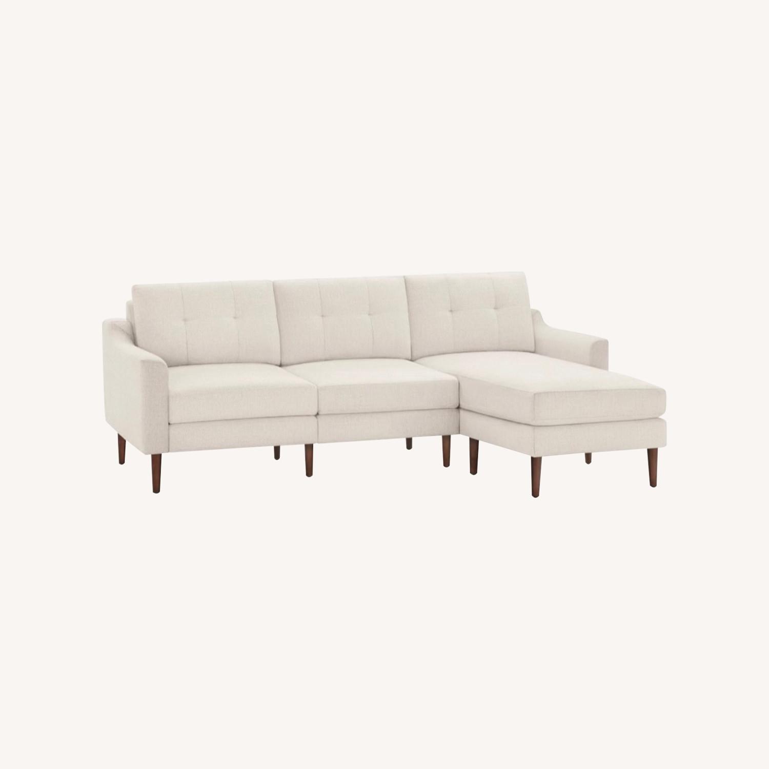 Seller's Notes:Ivory colored sectional couch with chaise from Burrow. Brand new, never been used, still in boxes. Sold on Burrow for $2,090. Nomad design with block arms and wood legs. Dimensions provided in the images. Includes built in USB charger for convenience. Pictures show model/color/size of couch, but exact couch that is for sale is brand new never been used. Ivory fabric and oak wood legs. Incredibly comfortable, great length chaise, sustainable eco-friendly materials.