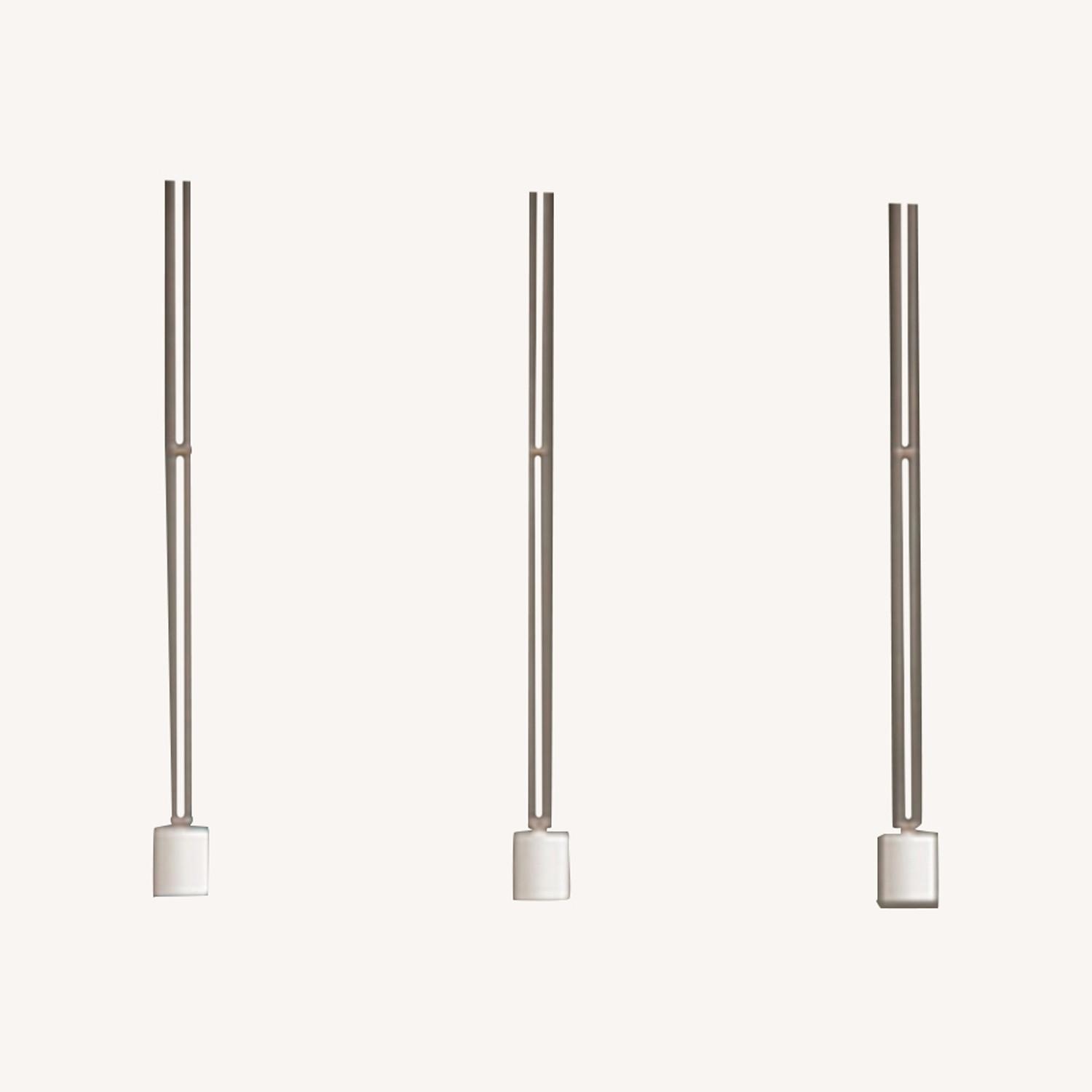 Seller's Notes:Buschfeld is a minimalist low voltage German lighting brand that was sold through Flos USA for years. I worked for the brand and bought these at the time. These are BLACK pendants, 12V MR16 bulbs, with small integral transformers in the canopy. These can install to standard residential wiring and jboxes. The canopies are 3.94” square. Installer may wish to update the bulbs and transformers for consistency when installing. The heads are 2” diameter, overall drop height with field cuttable stems is 39.4”. Canopies add 2” to the height.