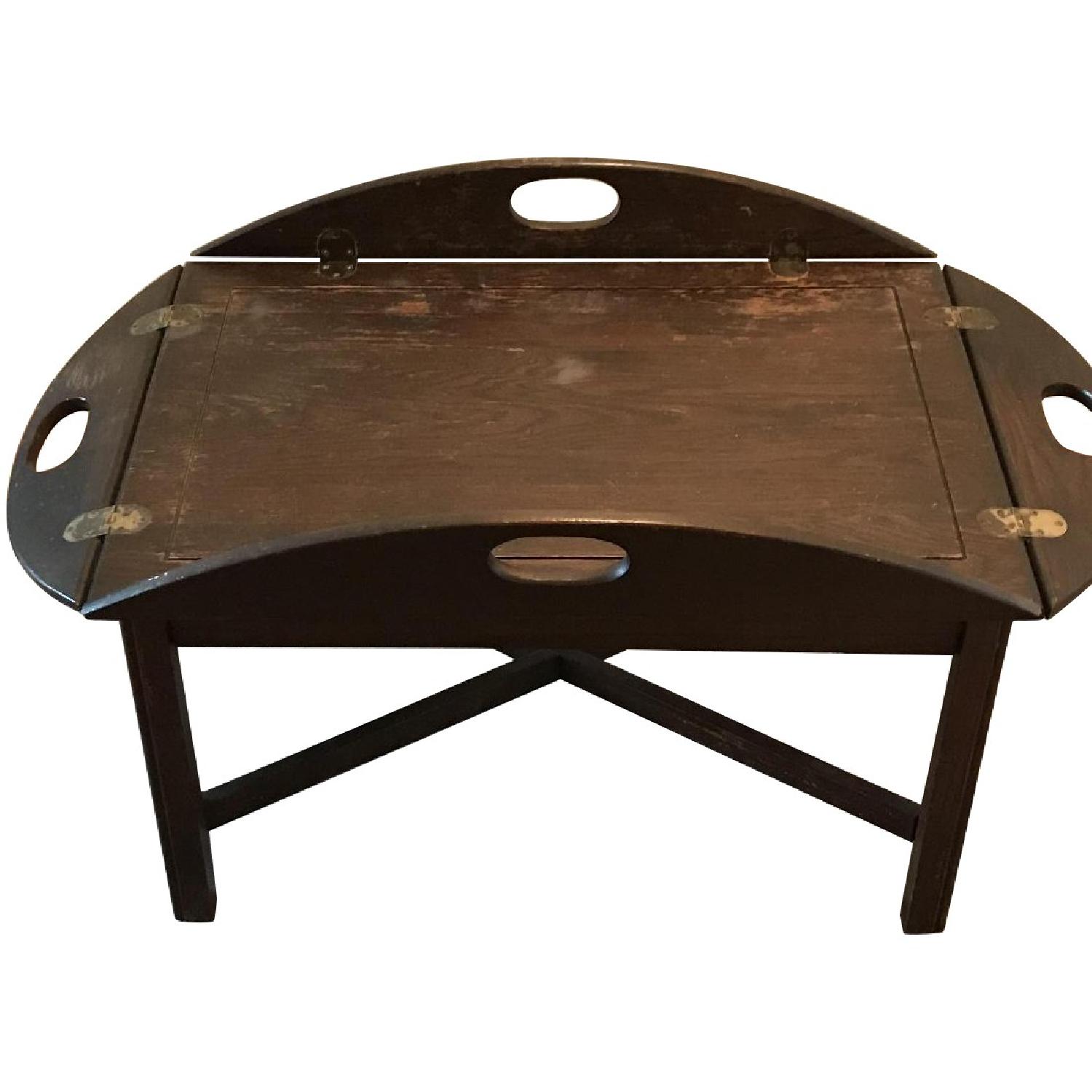 Seller's Notes:Made from solid hardwood, this butler tray coffee table has four hinged sides with antique brass finished hinges. The top tray easily lifts off the base for functionality. The table is solid, but in used condition. The two short ends are loose and do not stay flipped up, but may be easily repaired. With the sides open, the table measures 30 x 41 x 18.