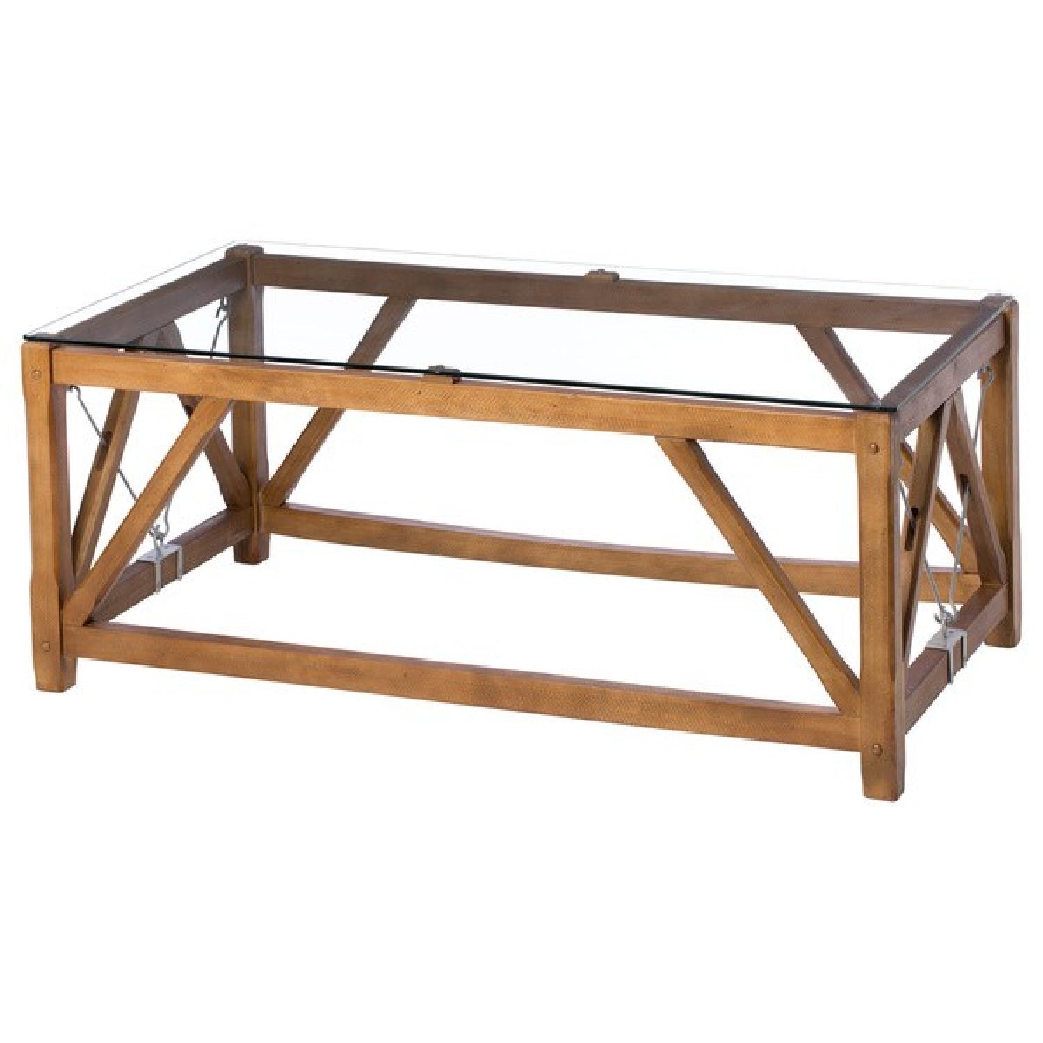 Seller's Notes:I purchased this coffee table 3 years ago and have loved it! It's in great condition and ready for a new home. I'm going for a more modern look in my new apartment so purchased a new coffee table. It's in great condition! From the website - Add an element of rustic, contemporary, and transitional style to your home with the Cable coffee table. The solid wood with a rustic finish provides a reclaimed look and lends a country feel to your home. Meanwhile, the combination of rustic wood and stainless steel creates the contemporary and transitional look of the piece. Featuring solid wood frame and legs in weathered brown/grey oak combined with a clear, tempered glass top, provides a functional tabletop to the rectangular Cable Coffee Table. Meanwhile, the scratch resistant stainless steel rods and brackets provide durability to the Cable Coffee table. Cable coffee table features solid wood frame and legs in weathered brown/grey oak, clear, tempered glass top, and scratch and mark resistant stainless steel rods and brackets Cable coffee table features reclaimed look Matching end table and sofa table sold separately Table measures 19"H x 47"W x 24"D